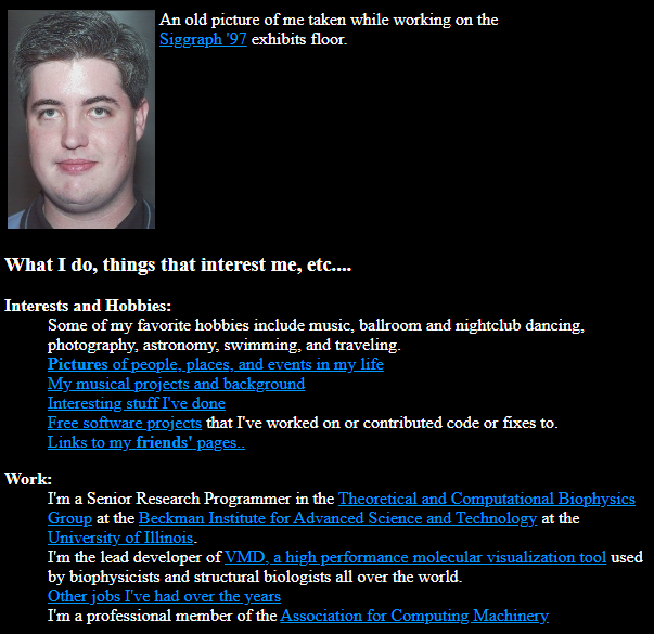 “These are pictures taken on November 11, 1999 in the CAVE at NCSA where we were testing out VMD (Visual Molecular Dynamics) the molecular visualization software that I develop at the Beckman Institute. After we all played with VMD for a while, we spontaneously realized that we should be taking pictures of it with Kirby’s digital camera since we didn’t have any pictures of VMD in the CAVE yet. (we had already been running it for an hour, so the picture taking was the last thing we did.) Once we got tired of playing with VMD, we decided to relax with some CAVE Quake :-).
