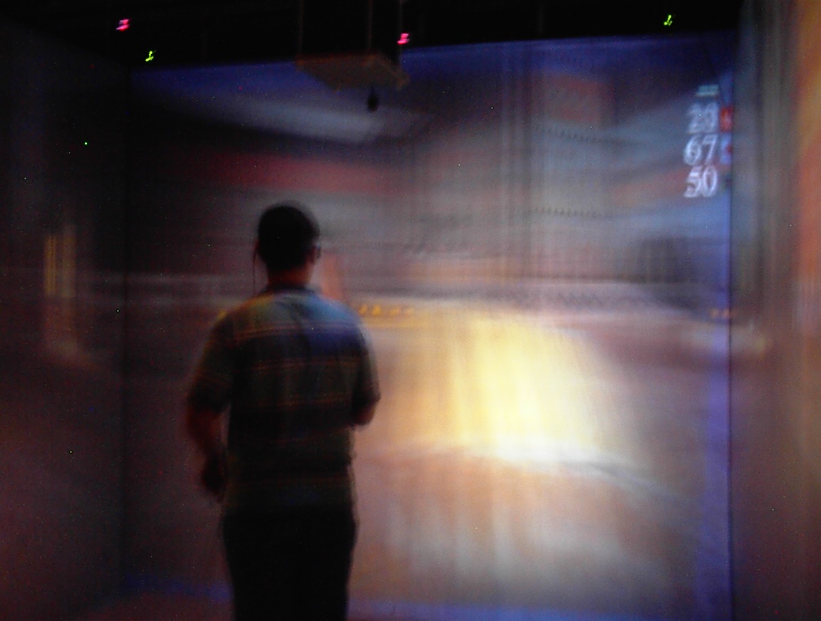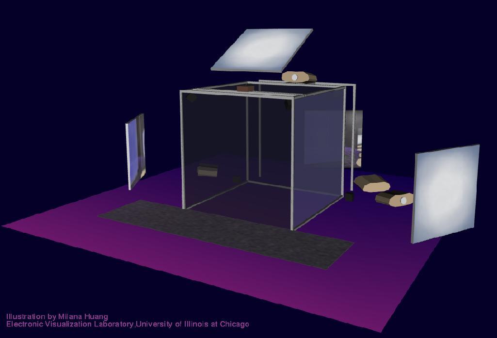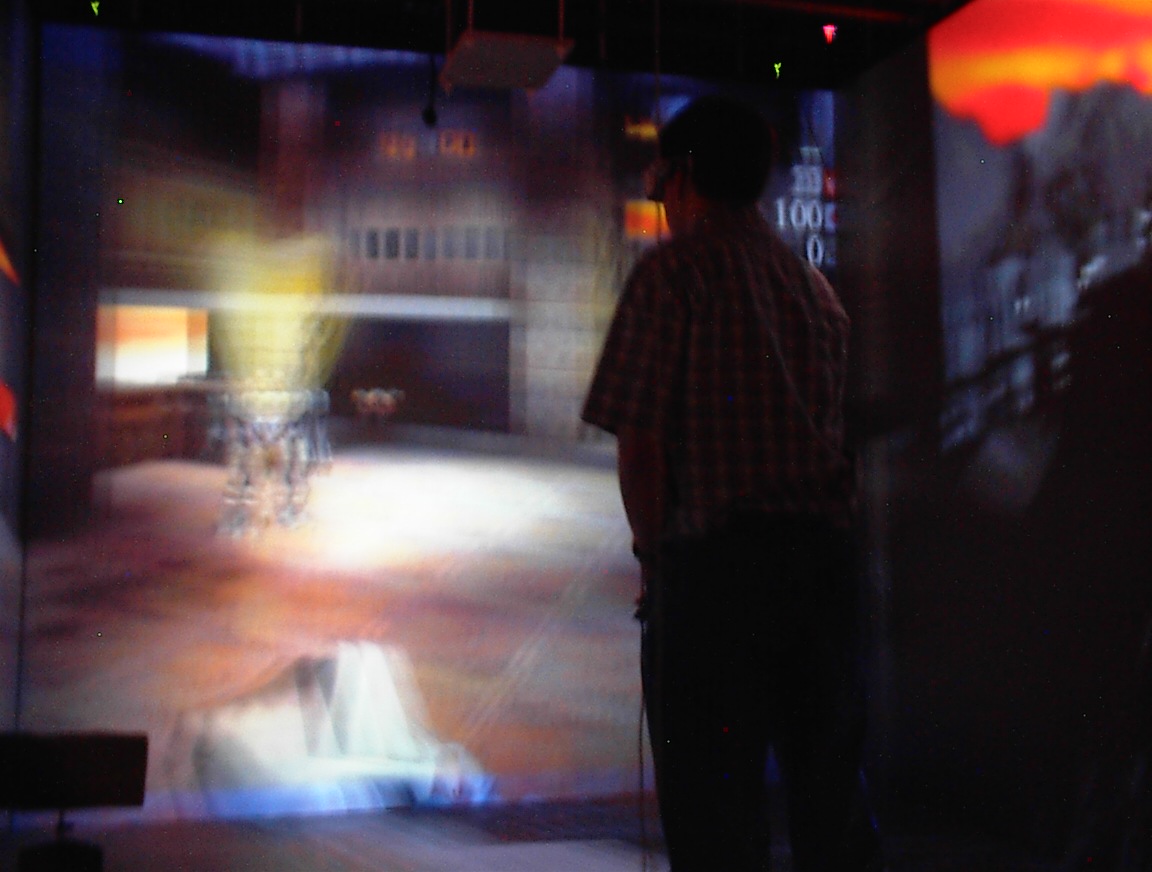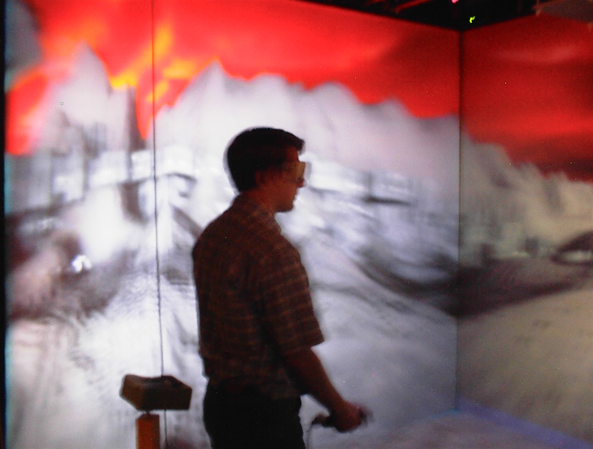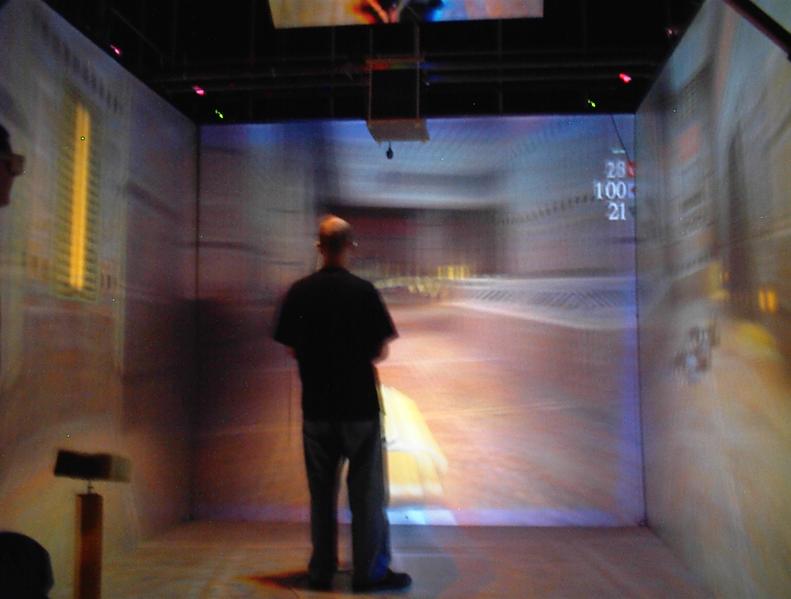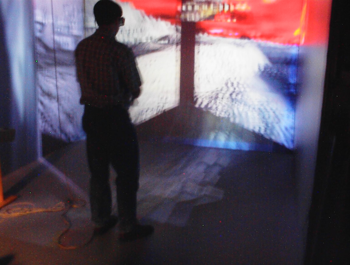 The images on the walls appear blurry to the digital camera, because they are stereoscopic images which are updated 120 times per second. This is much faster than the exposure time of the camera that took the pictures. Also, when you use the CAVE, you normally wear active LCD shutter glasses which alternately polarize the left and right eyes, causing each eye to see only its own custom image, so that the user sees the ‘world’ in stereo. Since the camera wasn’t ‘wearing’ the LCD shutter glasses like we were, it sees both images at once, so several frames of the 3D images are blurred together in these pictures. We may end up trying this again sometime, with faster exposure times.