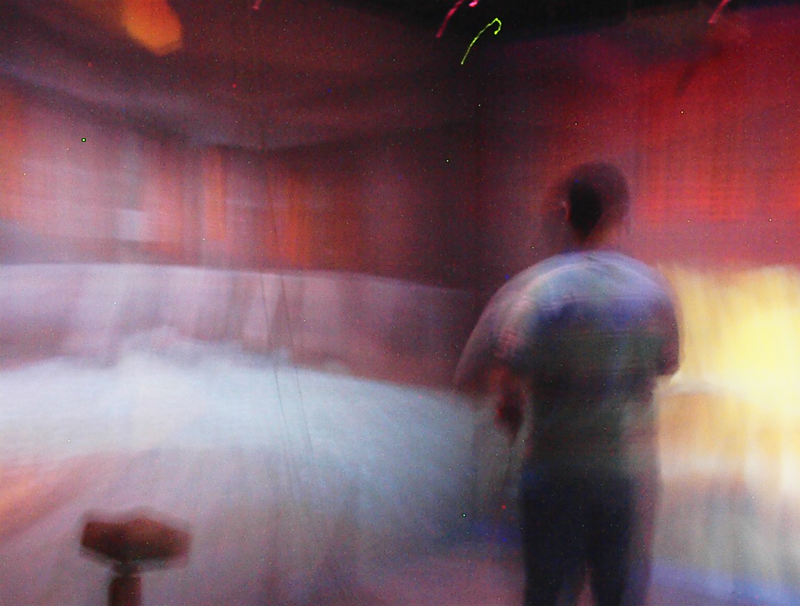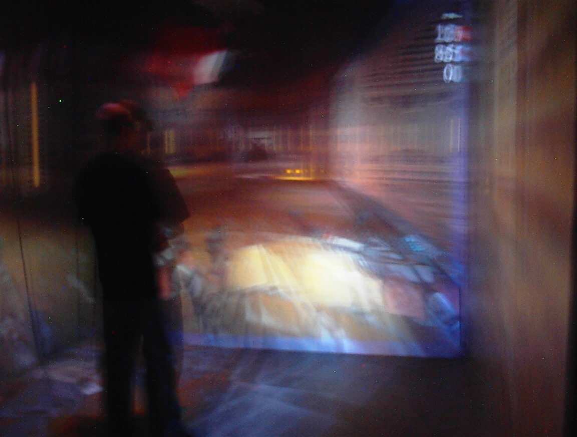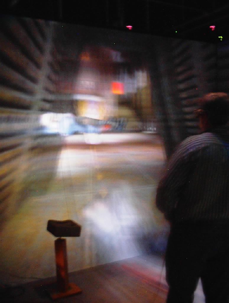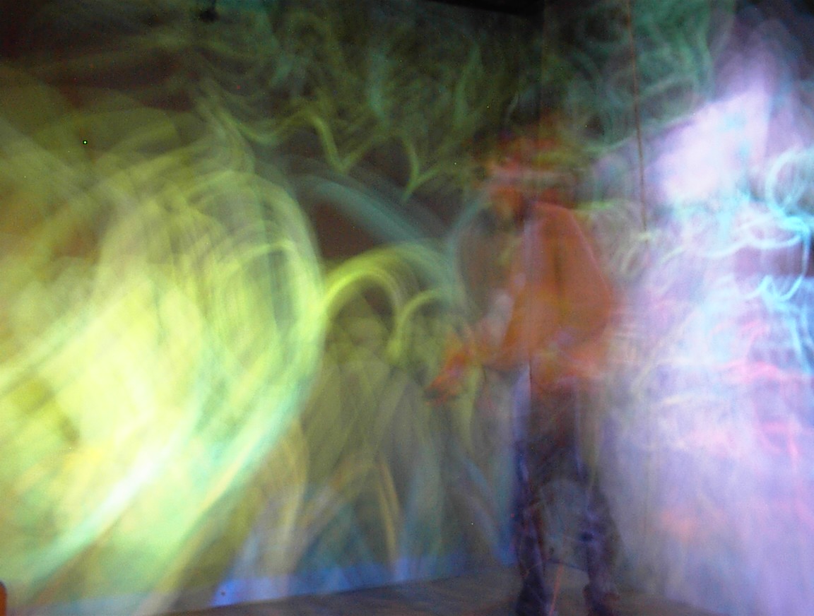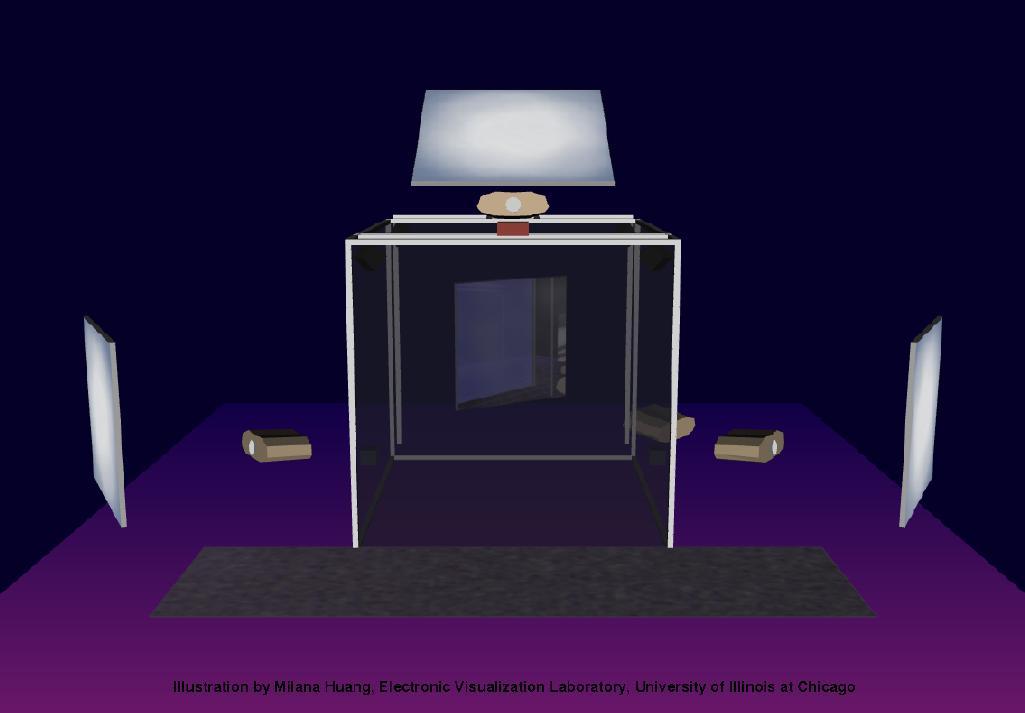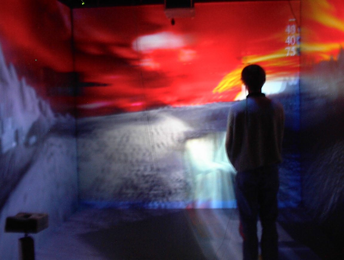 The images on the walls appear blurry to the digital camera, because they are stereoscopic images which are updated 120 times per second. This is much faster than the exposure time of the camera that took the pictures. Also, when you use the CAVE, you normally wear active LCD shutter glasses which alternately polarize the left and right eyes, causing each eye to see only its own custom image, so that the user sees the ‘world’ in stereo. Since the camera wasn’t ‘wearing’ the LCD shutter glasses like we were, it sees both images at once, so several frames of the 3D images are blurred together in these pictures. We may end up trying this again sometime, with faster exposure times.