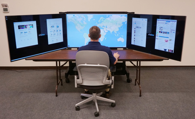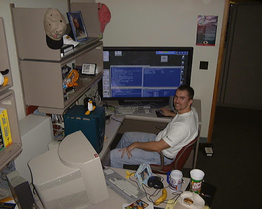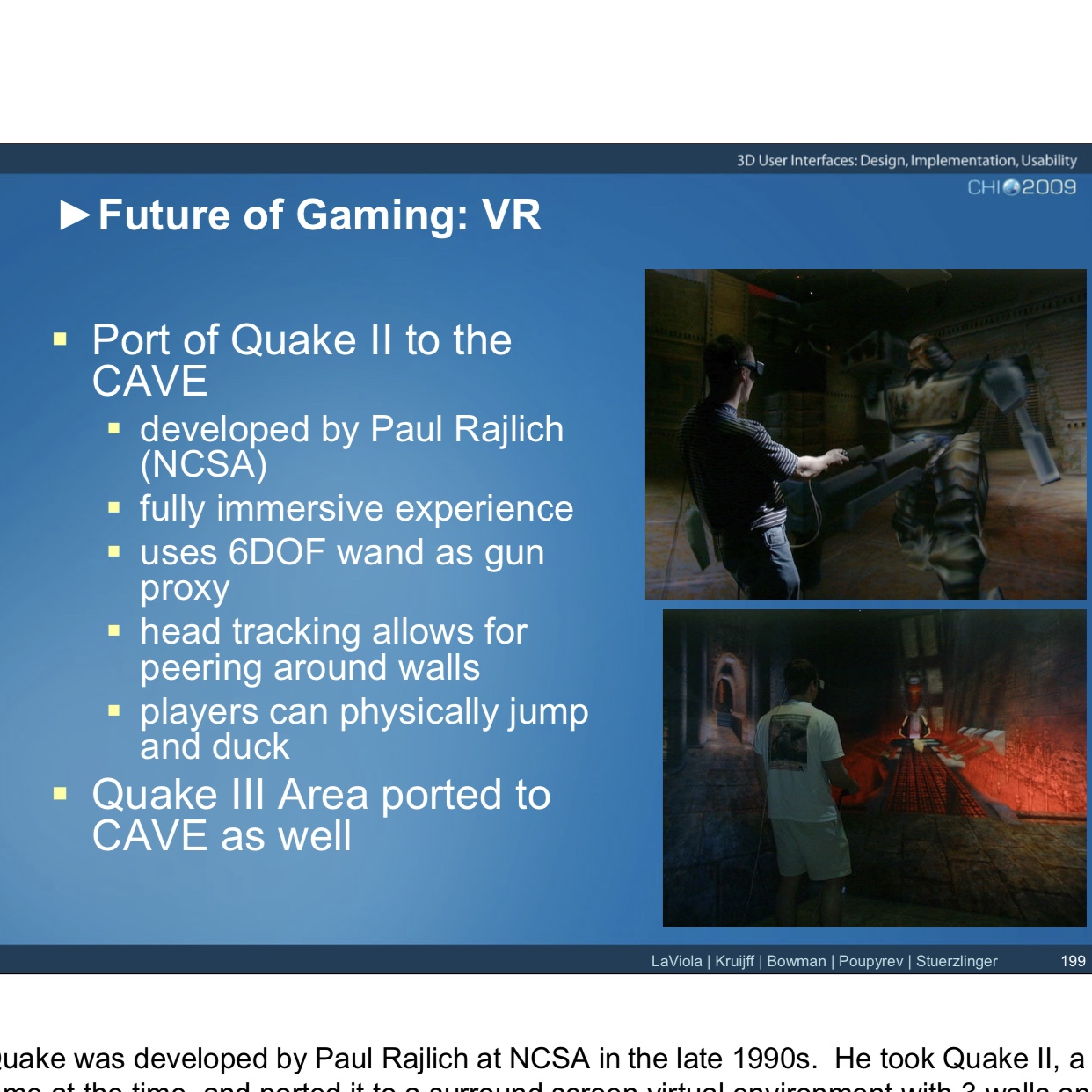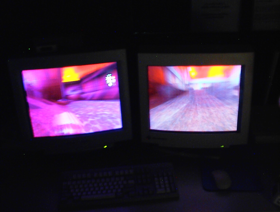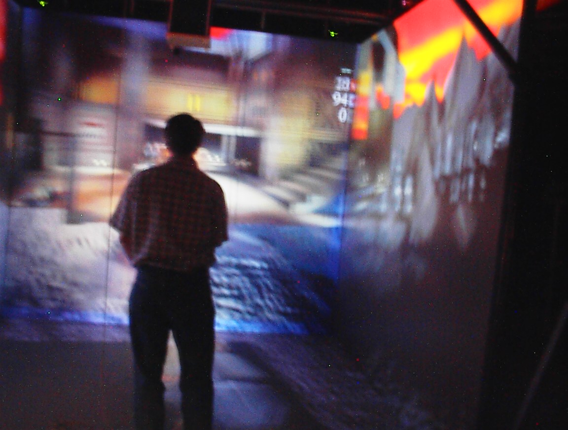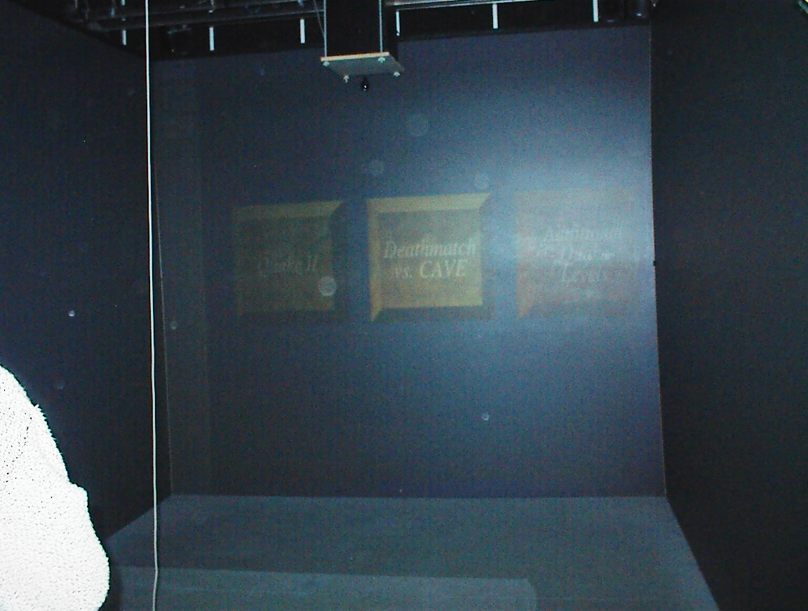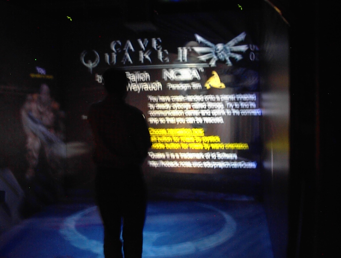 The rest of the pictures: Kirby running. VMD Dave running. VMD Dave running. VMD. The CAVE login screen. CAVE Quake II start screen. Jim playing CAVE Quake II. Jim playing CAVE Quake II. Jeff playing CAVE Quake II. Jeff playing CAVE Quake II. Jeff playing CAVE Quake II. Jeff playing CAVE Quake II. Jeff playing CAVE Quake II. The CAVE console monitors. Jeff playing CAVE Quake II. Jeff playing CAVE Quake II. John (me) playing CAVE Quake II. John (me) playing CAVE Quake II. John (me) playing CAVE Quake II. Someone standing at the Quake startup screen. Jim playing CAVE Quake II. Jim playing CAVE Quake II. Jim playing CAVE Quake II. Jim playing CAVE Quake II. Jim playing CAVE Quake II. Jim playing CAVE Quake II. Jim playing CAVE Quake II. Jim playing CAVE Quake II. Kirby playing CAVE Quake II. Kirby playing CAVE Quake II. Kirby playing CAVE Quake II. Kirby playing CAVE Quake II. Dave standing on a chair to see over a barrier. Dave playing CAVE Quake II. Dave playing CAVE Quake II.”