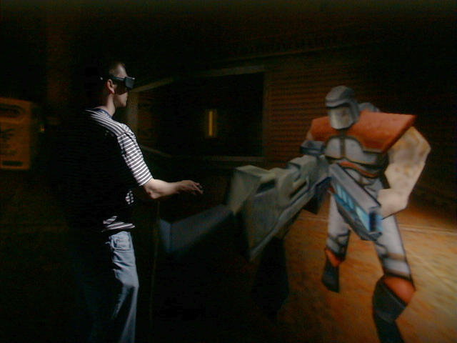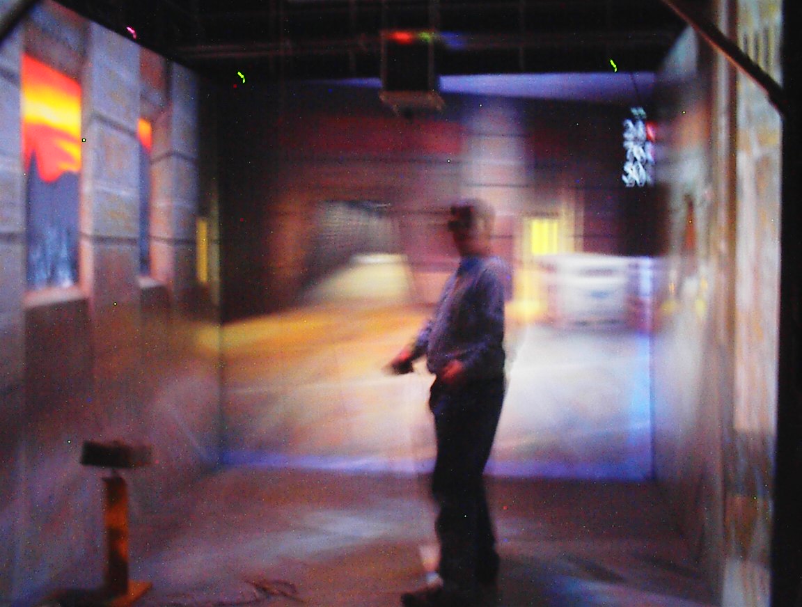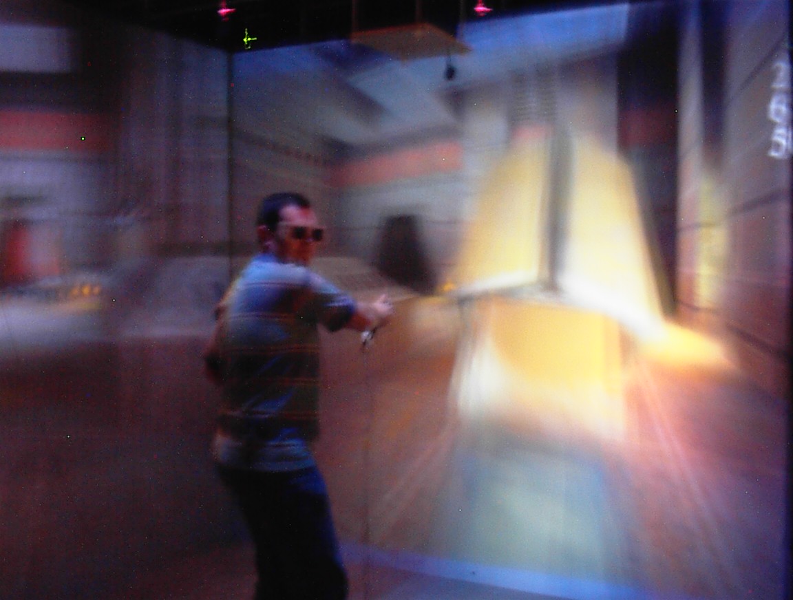 The best pictures: Jeff standing in the CAVE waiting. Kirby running. VMD Kirby running. VMD John (me) running. VMD John (me) running. VMD Buttonfly. Jim wishing that the CAVE had gesture recognition Dave and Jim standing in the CAVE waiting for something to happen. Jim getting ready to play CAVE Quake II. Jim playing CAVE Quake II. Jim playing CAVE Quake II. Dave playing CAVE Quake II. Jeff playing CAVE Quake II. Jeff playing CAVE Quake II. John (me) playing CAVE Quake II. Kirby playing CAVE Quake II. Kirby dying in CAVE Quake II. Dave playing CAVE Quake II.