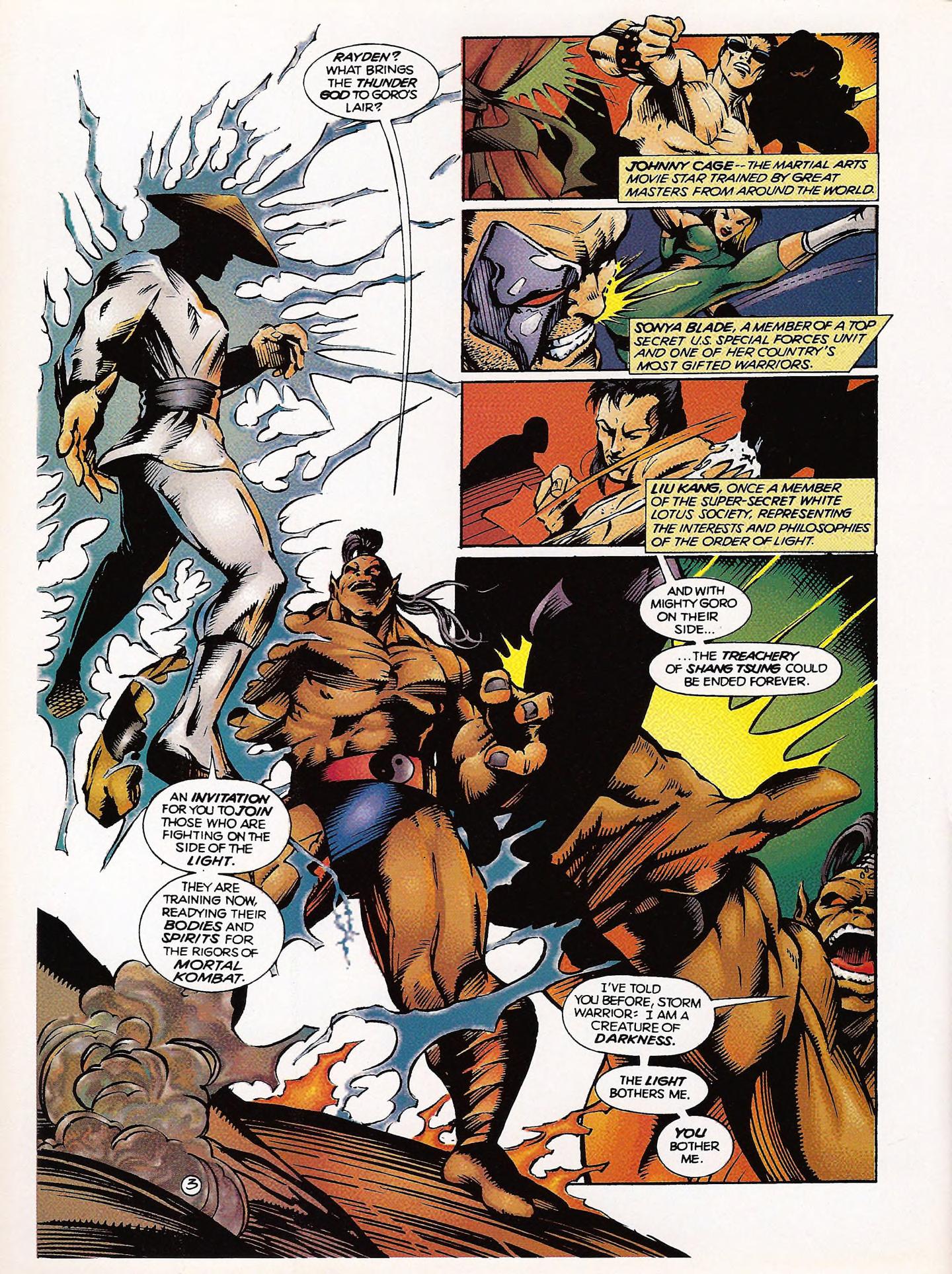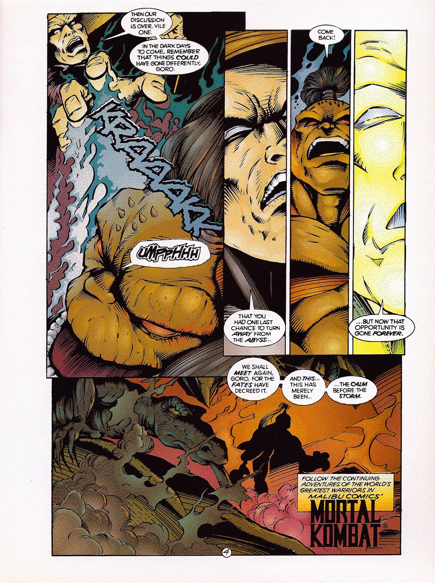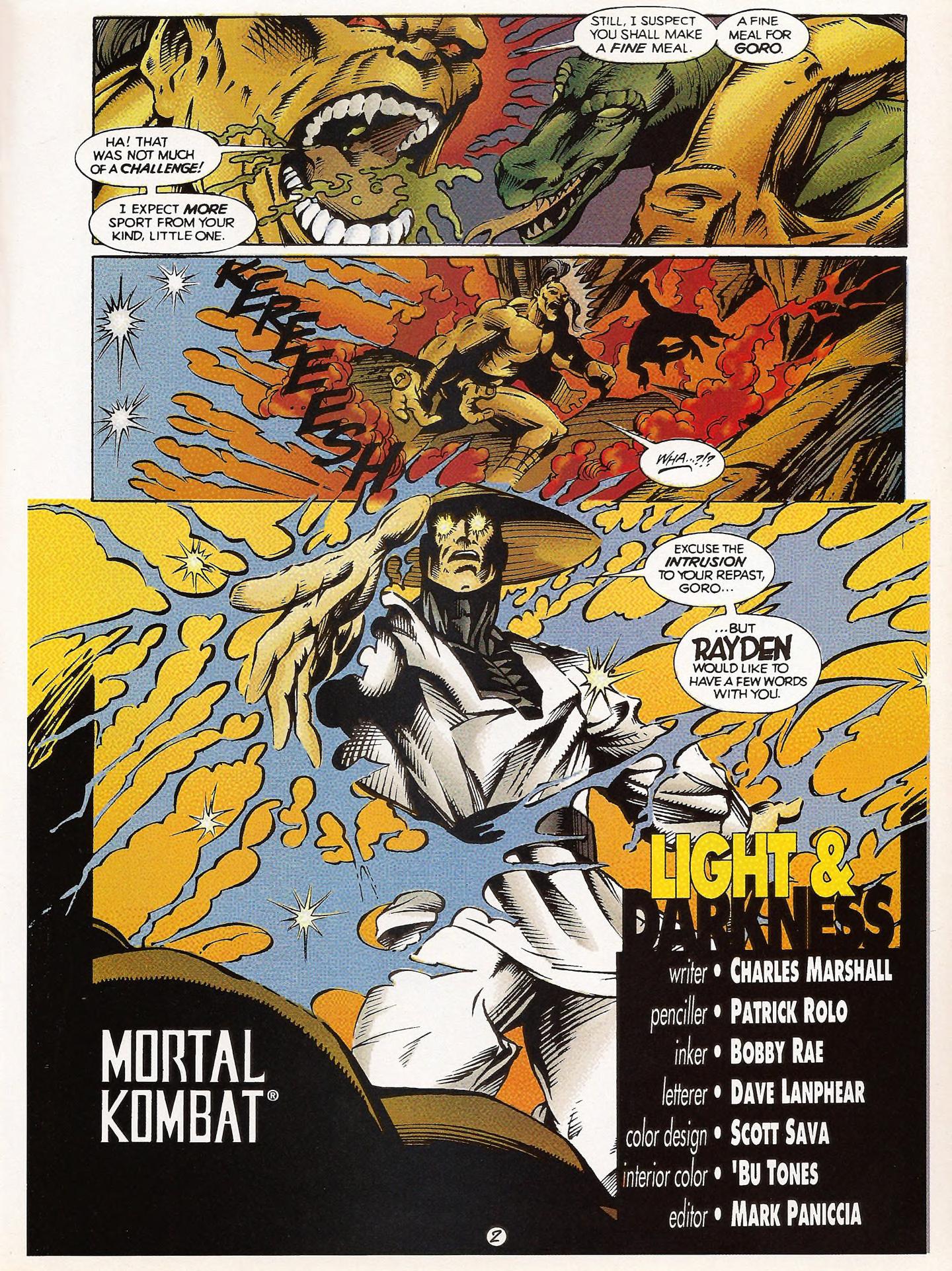 “‘Rayden? What brings the Thunder God to Goro’s Lair?’ ‘An invitation for you to join those who are fighting on the side of the Light. They are training now, readying their bodies and spirits for the rigors of Mortal Kombat.'”