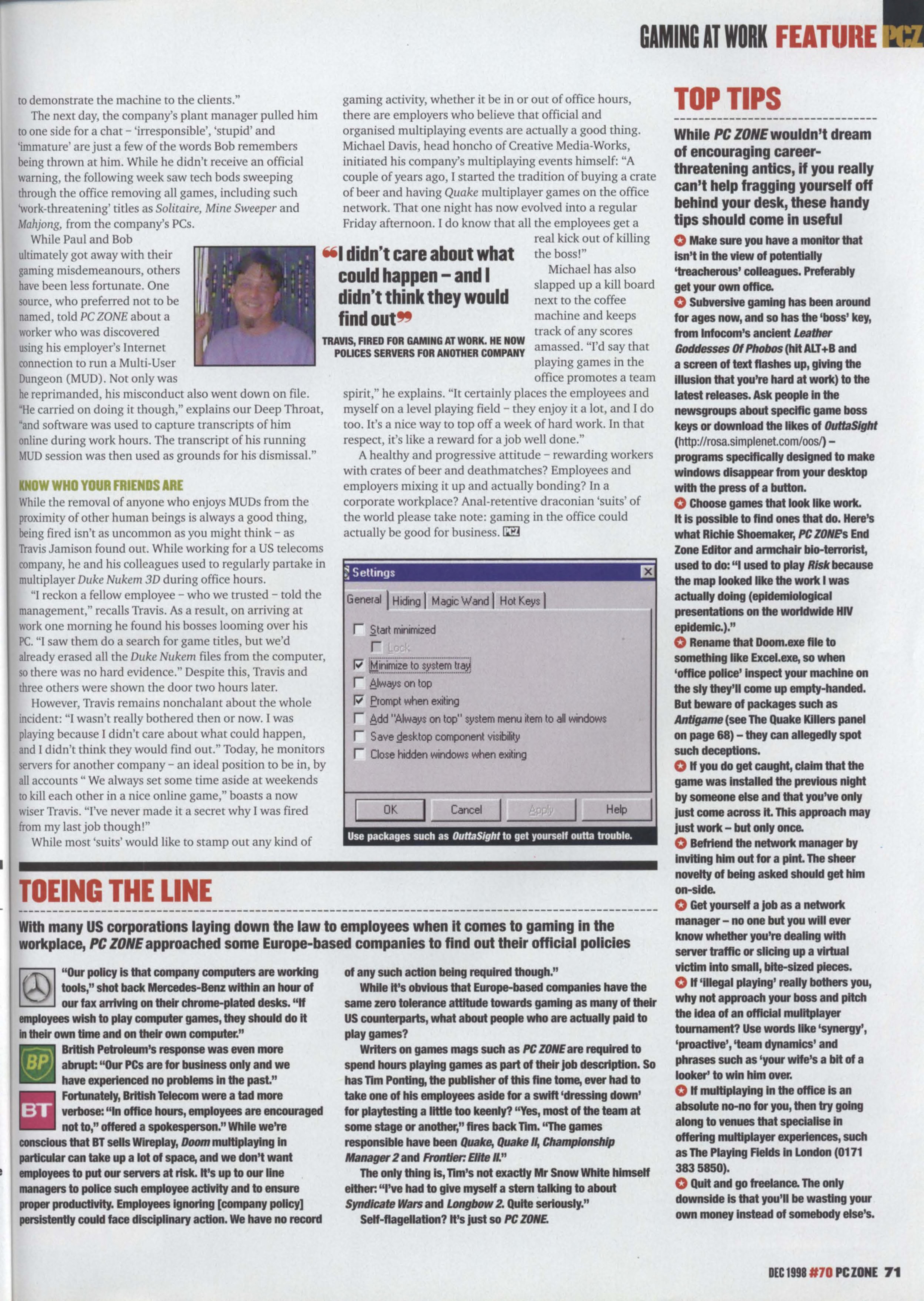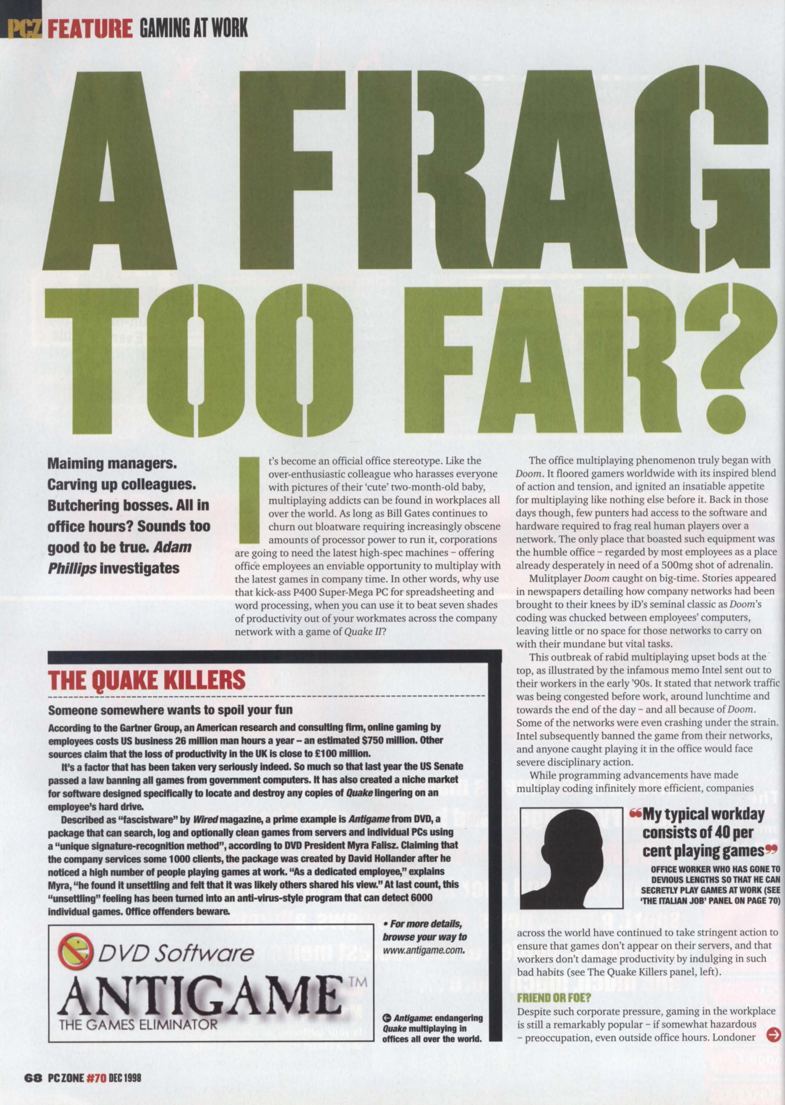 “As long as Bill Gates continues to churn out bloatware requiring increasingly obscene amounts of processor power to run it, corporations are going to need the latest high-spec machines — offering office employees an enviable opportunity to multiplay with the latest games in company time. In other words, why use that kick-ass P400 Super-Mega PC for spreadsheeting and word processing, when you can use it to beat seven shades of productivity out of your workmates across the company network with a game of Quake II?”