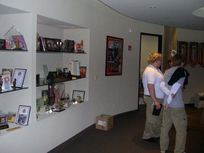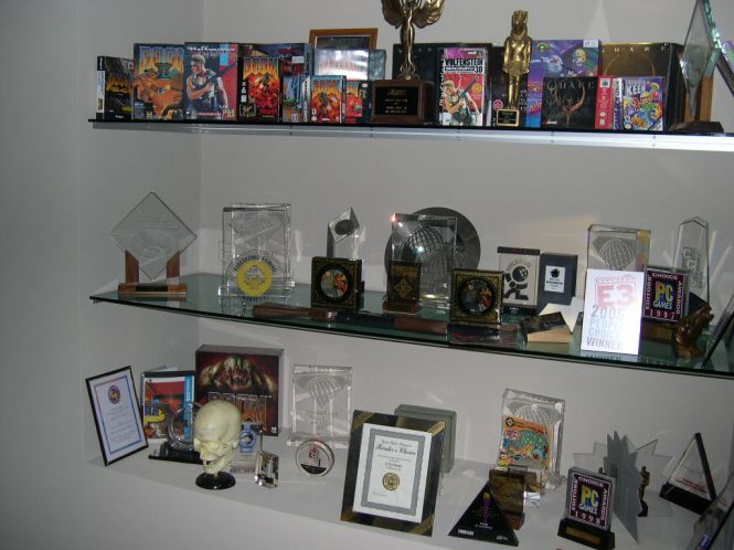 “When first entering the two story office building where id Software is currently headquartered… you are greeted by a huge DOOM logo, multiple pinball machines, and lots of awards blanketing the walls. Right behind id’s secretary, Donna Jackson, you will find a room holding a original DOOM figure sculpted by id years ago. The id trophy shelf also located in the lobby, consists of various game boxes and awards id has won over the years.