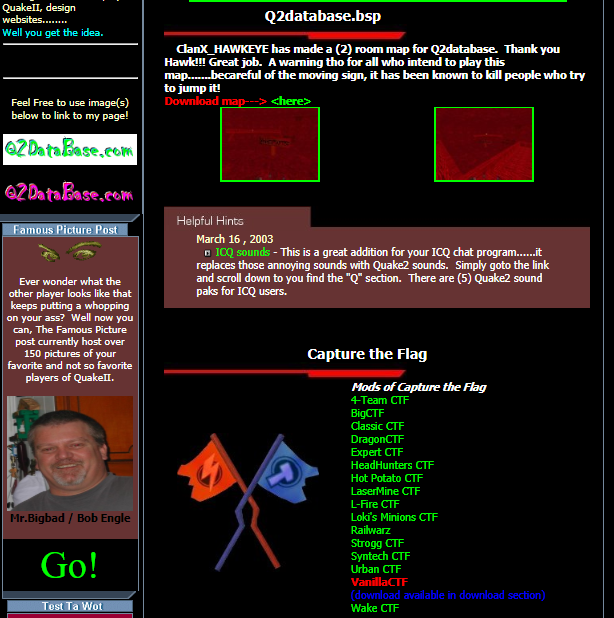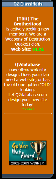 “Q2database is your complete source for Quake II information. The ‘Daily News’ section is updated most every day, so make sure you return here often to see whats happening in the world of Q2. You can get the 3.20 patch here and instructions on how to set it up (easier then you think). There are tons of information listed within this site. If there is something you are looking for and do not see it here, please contact me. Don’t miss the ‘Meet the Player’ section complete with picture posts. Browse over the other players listed, you may know some of them and while you are there… send in your stats. Copyright © 2002 Herb Phillips.”