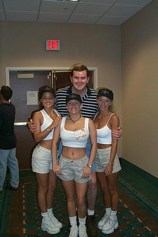 “Paul Steed talks to the crowd on stage with his booth babes.”