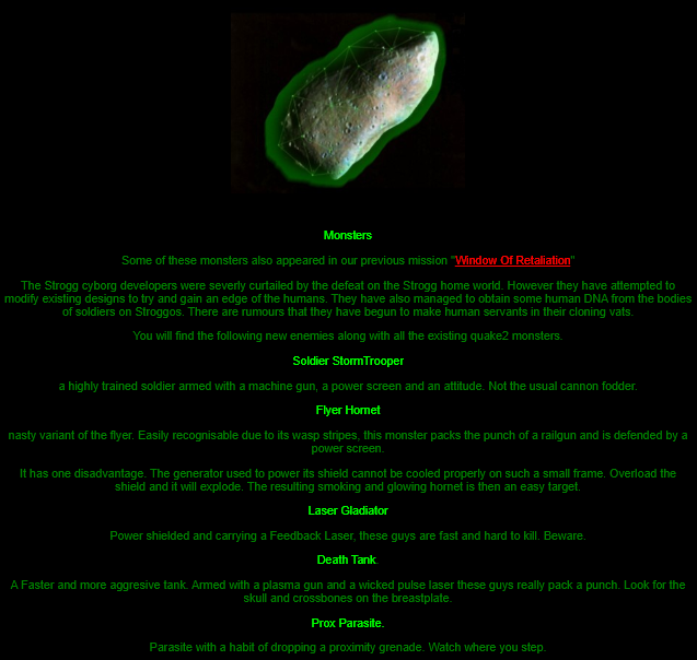 “All the usual quake2 weapons are available to you on this mission. There have also been some new weapons developed since the original conflict. Some of these weapons were available in our previous mission ‘Window Of Retaliation’