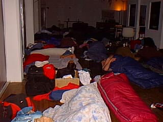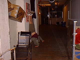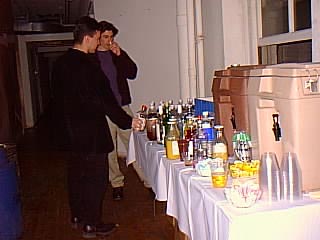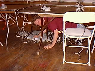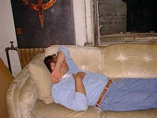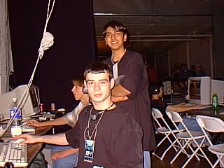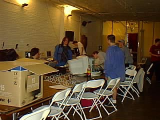 We set up a little baby network, and started a few practice games o’ quake. I also got to meet Phoebus, who preceeded to whoop my ass for the first time (of many over the course of the weekend). Around 7 or so, the festivities officially began, as we setup computers. Buddy o’ the boi, Jordan who goes through nicknames like water (he decided on Huey for the weekend) showed up, and helped us lug in some crap (Voltas, you got one hell of a heavy computer, dude). Regardless, the network setup, the games began full force, and it didn’t take long for me to realize that in fact, as I previously suspected, I am really out of practice. After enduring a barrage of insults to my trackball (from everyone from Blue to Gandalf) I finally got a few decent frags in, and anyone within a ten foot radius can attest to the fact that my nickname is quite appropriate when I’m winning (I laugh like, well…a loon). After a spell, I met Kolinahr (quiet dude…), RadPipe (nice guy…too bad he was so dang busy) and I’m sure more people then I can possibly remember right now.