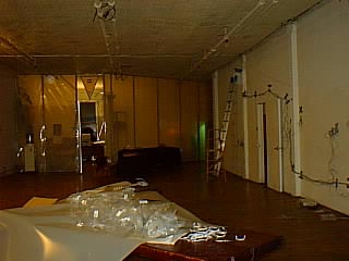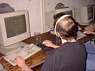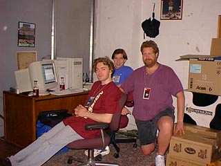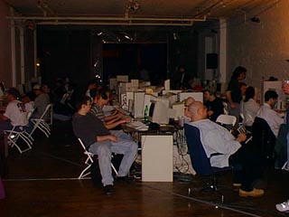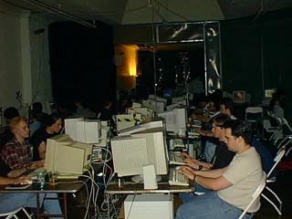 “Well, here it is. It’s hard to believe! At least 85 machines, all running Quake — every square inch of table and floorspace is covered by computers and cables and technology. No, not a square inch is unused. Is there space between those subwoofers and 17” montiors? Hell, I’ve got a laptop. Let’s go!