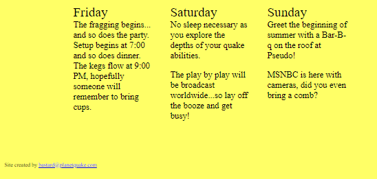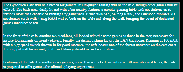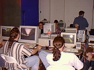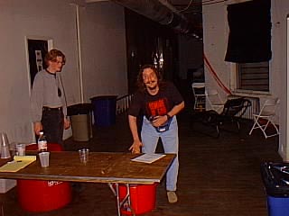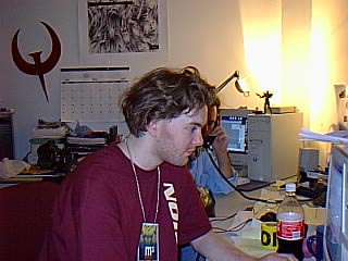I used saturday as an excuse to prove to the world that a Monster 3D can even make a p100 with 16 meg of ram a great Quake machine. GlQuake turned more than a few heads, even on my crappy system. I had a few plesant words with the Klingon-Rebel himself, Joost (get back to Aftershock, dammit!) and Dweomer, the busiest man alive (next to Cal, of course, who must have been taking IV shots of Caffeine all weekend).