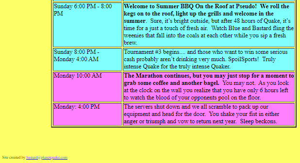 It’s only Friday night, and there’s three days left to go. Nobody has even thought of going to sleep; as I type this update, there’s still beer left and only Bastard of Planetquake has succumed to slumber. (it’s been a rough day — Can you blame him?) I’ll be here all weekend reporting the madness, but in the meantime you can get a feel for the carnage with these screenshots.