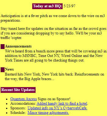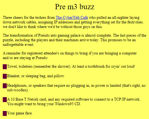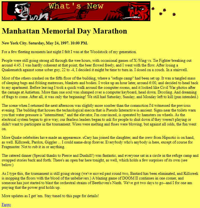 It’s M3, and no other Quake event — not even the Quakeworld Launch event of September, ’96 — could match the adrenaline. Machine after machine is rumbling with the chaos of a deathmatch such that New York has never seen.