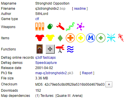 “q3strongholdv2.bsp — Stronghold Opposition for Q3A, version 2.0, by Remco SithLord Mooijweer, April 12, 2001, for Quake III Team Arena. Stronghold Opposition for Q3A is a CTF map based on Quake 2 CTF’s q2ctf2.bsp — Stronghold Opposition, but built from scratch. Additional credits to id software for Quake III Arena & Quake III Team Arena — Kiltron for his texturepacks — Evil Lair for the crate textures — Dave ‘Zoid’ Kirsch for the original mapdesign — Eraser, Lynx, Mr SDI, Menno de Benno, Nerdshuntress, r3tina, Unrevocable History and WayWard for play-testing and design tips.”