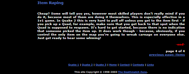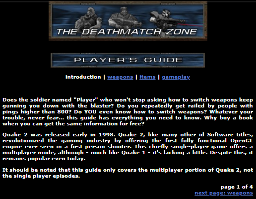 Deathmatch Zone: Quake 2 Screenshots — High-flying action, incredible gibs, and more! On March 10, 2020March 10, 2020 By DondeIn Community, Mods, Skills, The mods of Quake 2 Quake 1 Screenshots (just a small sample — there are many more on the Internet Archive!) https://web.archive.org/web/*/http://denken.com/dzone/screenshots/* The Deathmatch Zone: Player’s Guide to Quake 2 Deathmatch https://web.archive.org/web/20031206111425/http://www.denken.com/dzone/q2playersguide01.htm Deathmatch Zone Graphics for 2020