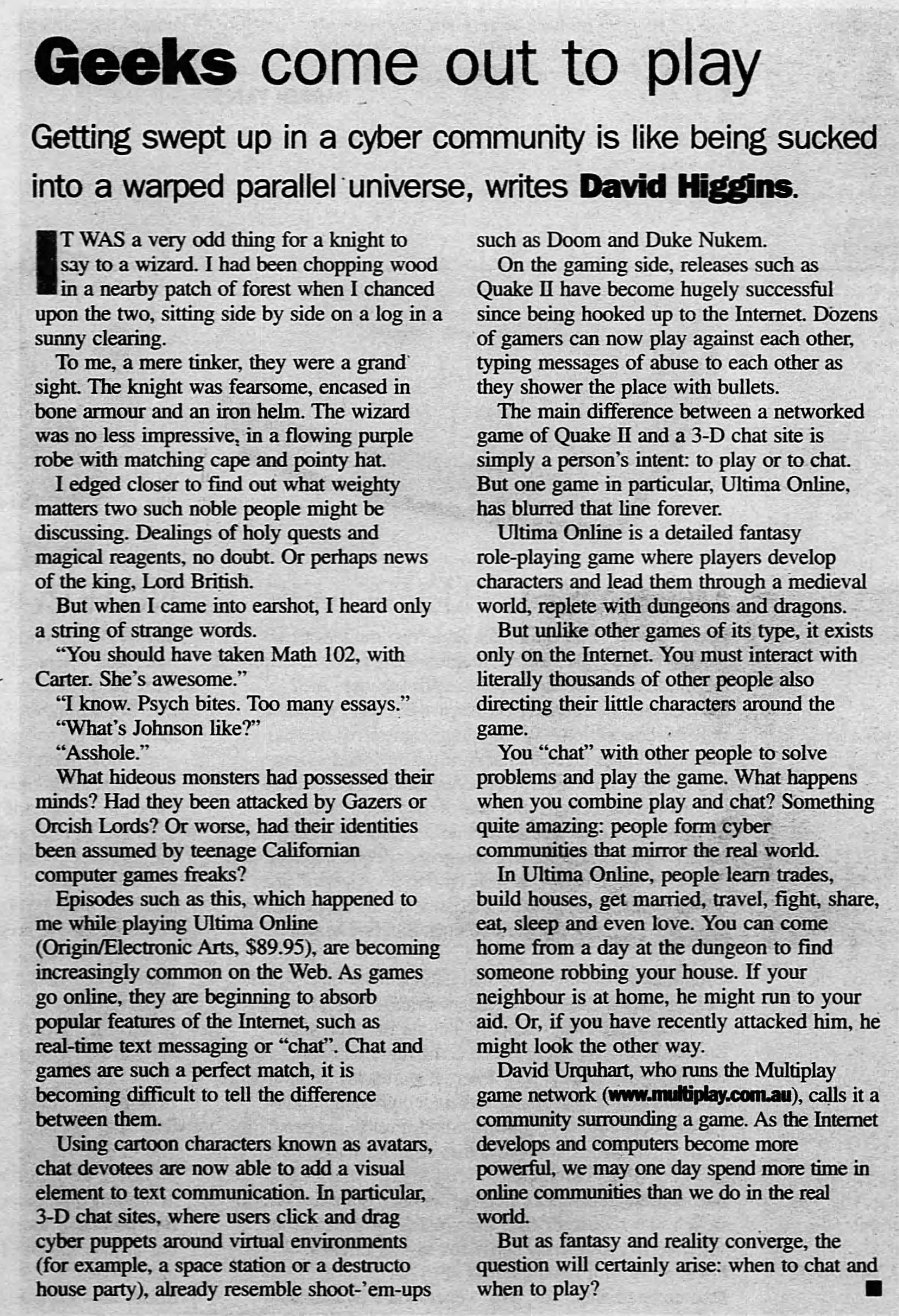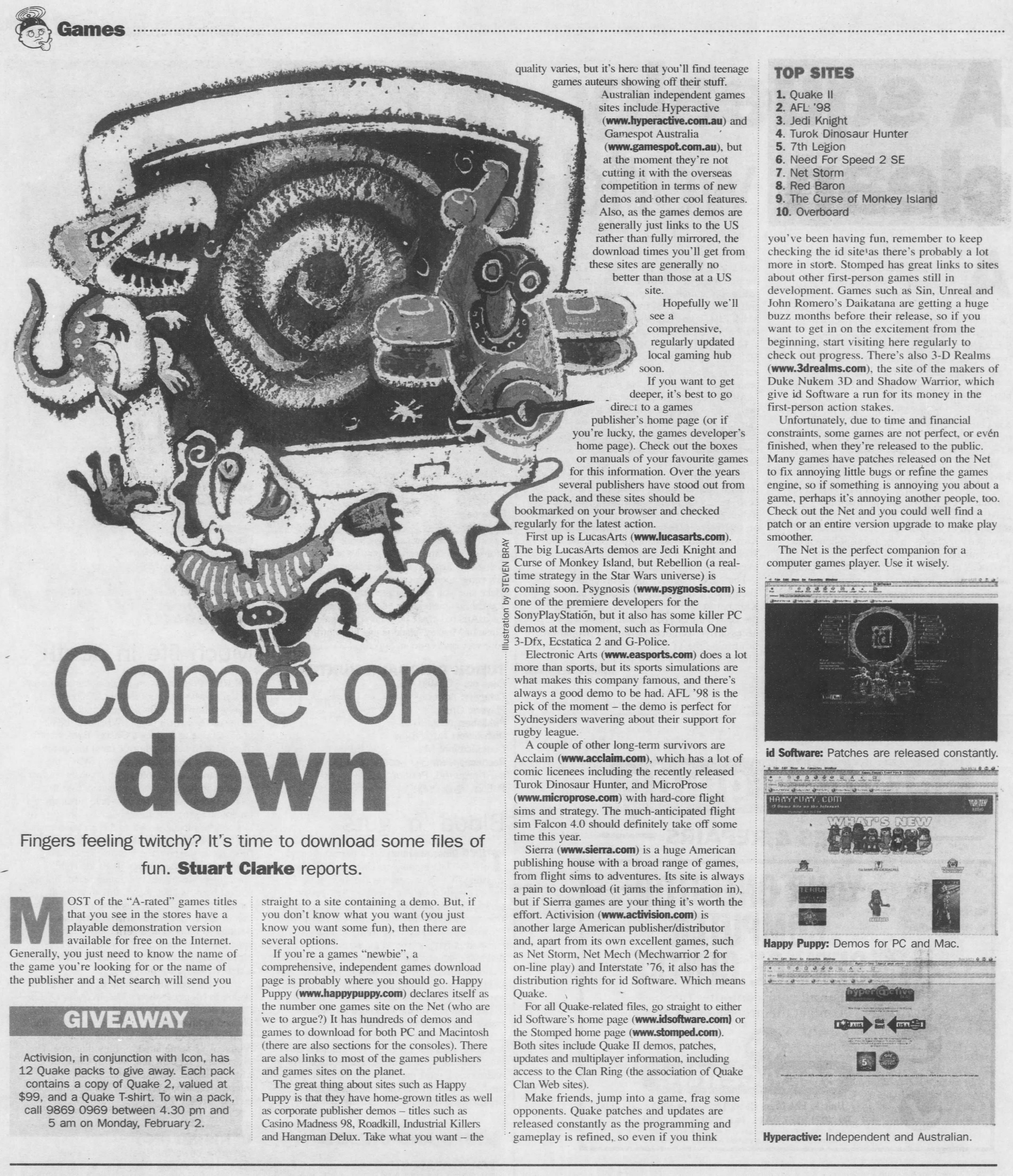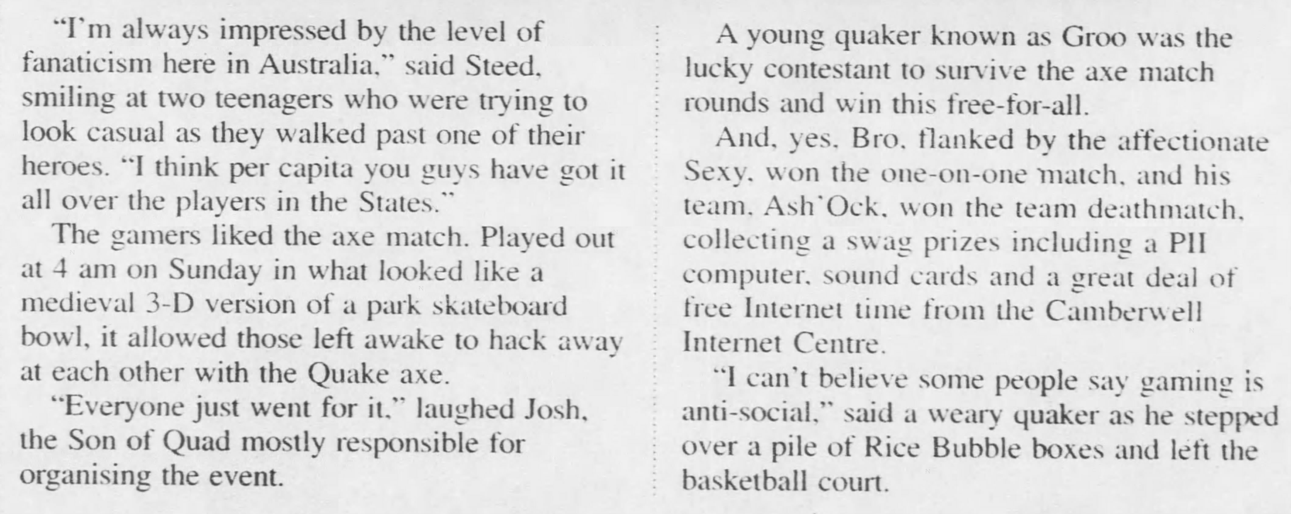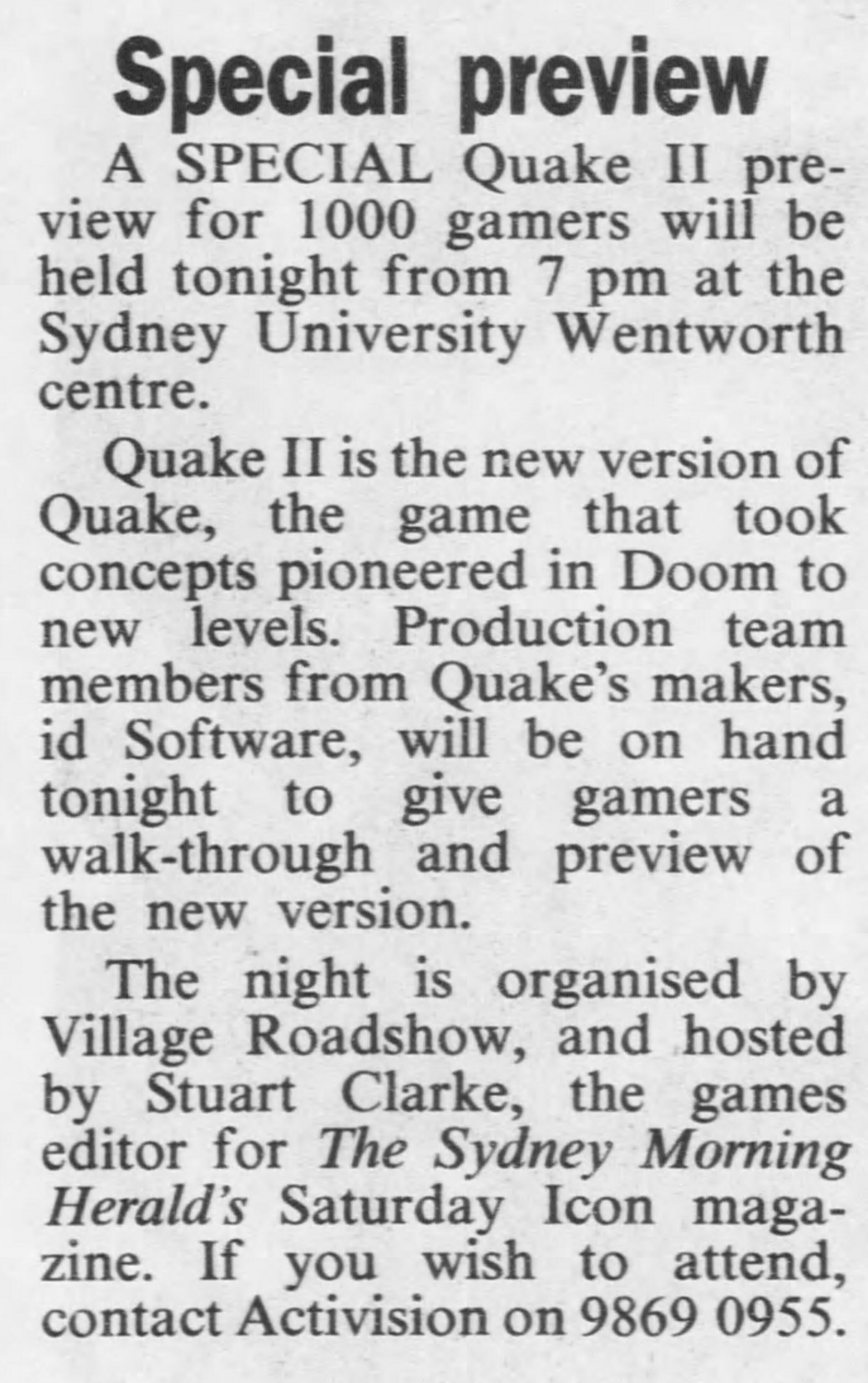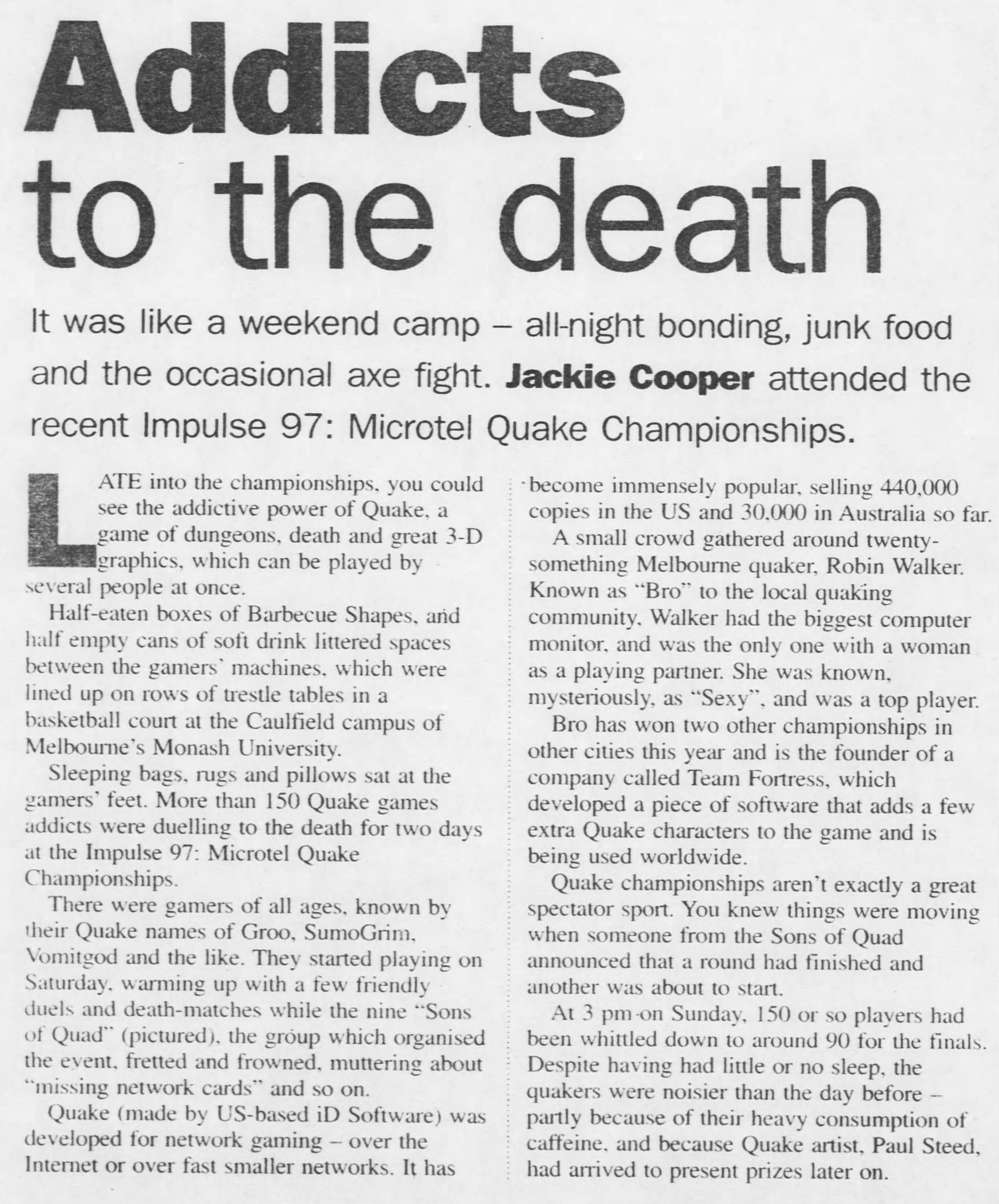 The Sydney Morning Herald — Icon Magazine: [Quake II,] Computers and Technology for the Rest of Us On March 11, 2020March 11, 2020 By DondeIn Community, E-sports, Female Gamers, Skills, The Quake 2 community -Newspapers.com, The Sydney Morning Herald, Tuesday, October 25, 1994 -Newspapers.com, The Sydney Morning Herald, Tuesday, September 3, 1996 -Newspapers.com, The Sydney Morning Herald, Saturday, September 20, 1997 -Newspapers.com, The Sydney Morning Herald, Saturday, November 8, 1997 -Newspapers.com, The Sydney Morning Herald, Saturday, November 15, 1997 -Newspapers.com, The Sydney Morning Herald, Tuesday, December 2, 1997 -Newspapers.com, The Sydney Morning Herald, Saturday, December 6, 1997 -Newspapers.com, The Sydney Morning Herald, Saturday, December 13, 1997 -Newspapers.com, The Sydney Morning Herald, Saturday, December 20, 1997 -Newspapers.com, The Sydney Morning Herald, Saturday, January 24, 1998 -Newspapers.com, The Sydney Morning Herald, Saturday, January 31, 1998 -Newspapers.com, The Sydney Morning Herald, Saturday, February 7, 1998 -Newspapers.com, The Sydney Morning Herald, Saturday, March 21, 1998 -Newspapers.com, The Sydney Morning Herald, Saturday, April 4, 1998 -Newspapers.com, The Sydney Morning Herald, Saturday, April 18, 1998 -Newspapers.com, The Sydney Morning Herald, Tuesday, April 21, 1998 -Newspapers.com, The Sydney Morning Herald, Saturday, April 25, 1998 -Newspapers.com, The Sydney Morning Herald, Saturday, May 9, 1998 -Newspapers.com, The Sydney Morning Herald, Saturday, May 30, 1998 -Newspapers.com, The Sydney Morning Herald, Saturday, August 1, 1998 -Newspapers.com, The Sydney Morning Herald, Saturday, September 26, 1998 -Newspapers.com, The Sydney Morning Herald, Saturday, February 20, 1999 -Newspapers.com, The Sydney Morning Herald, Saturday, September 25, 1999