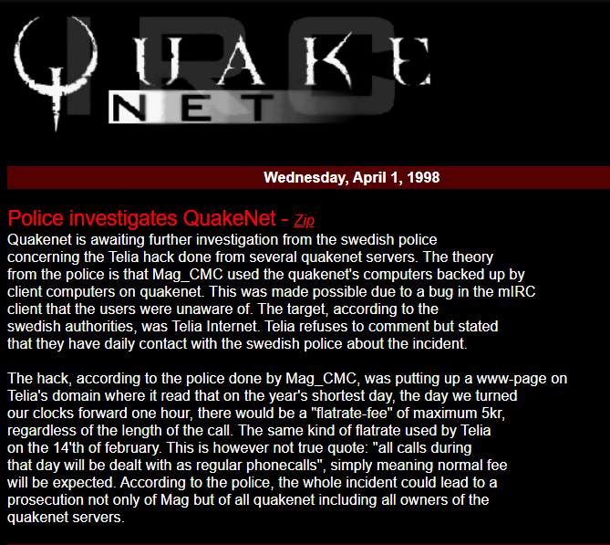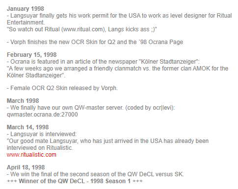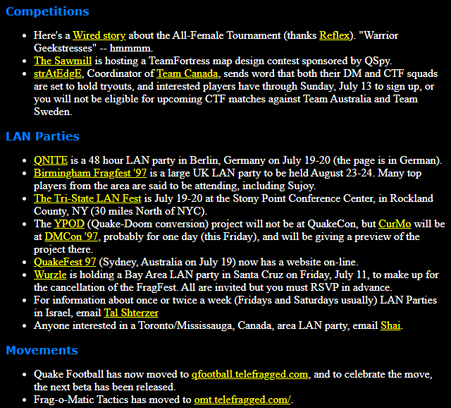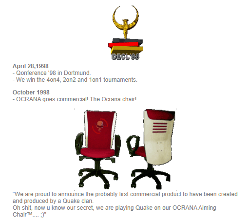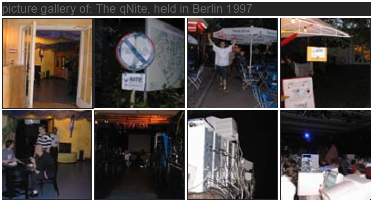 Clan Ocrana Lanology: QNITE — Photos from the 48-hour LAN party, held in Berlin, July 19 – 20, 1997 On March 14, 2020March 14, 2020 By DondeIn Community, E-sports, The Quake 2 community QNITE — Photos from the 48-hour LAN party, held in Berlin, July 19 – 20, 1997 Read about the experience. — Q-NITE: LAN Party Report – From Dusk Til Dawn OCRANA — History QNITE — Reflection QNITE — Blue’s News QNITE — Affiliated Websites https://web.archive.org/web/20010810090846/http://www.ocrana.de/ocrana2000/lanology.php3?name=qnite