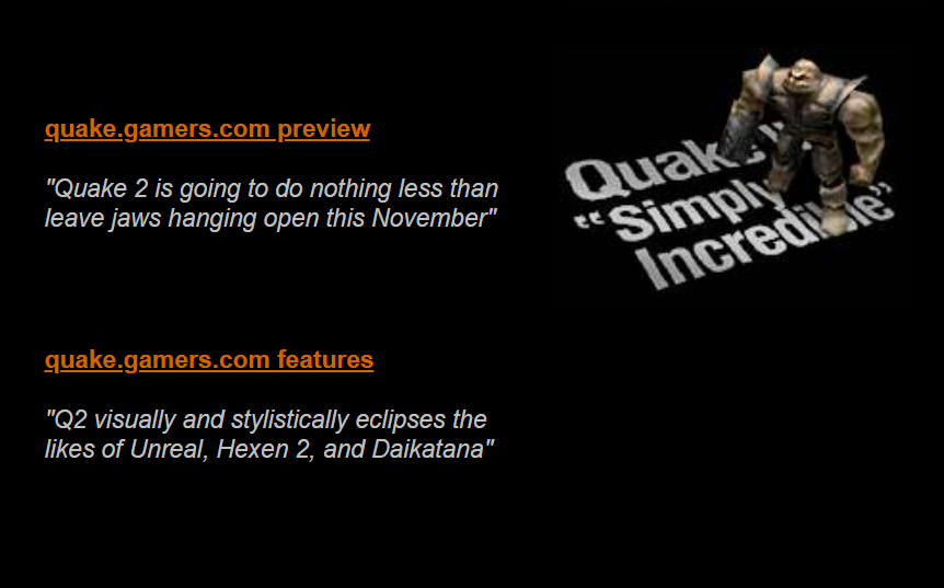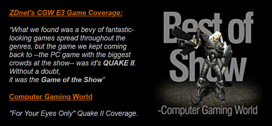 “Wipe that saliva from your mouth soldier! Save your spit for licking your wounds. You’ll have plenty of ’em after you battle the Strogg in this 3-level, action-packed Demo. Wake up soldier. This isn’t just a game. It’s Quake II.”