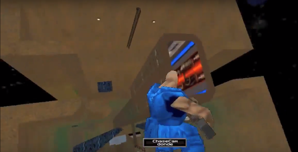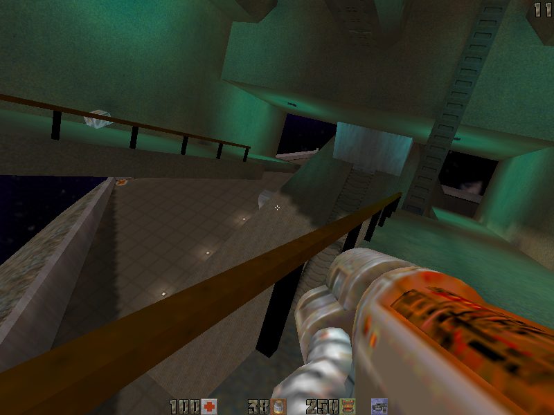 In the raised version of Big Space Gun, the faster your computer the faster you’ll be able to climb the sloped ladders. This is due to an odd quirk of the Quake 2 physics engine. If you have a slow system, stay away from the sloped ladders and use the teleporters instead.