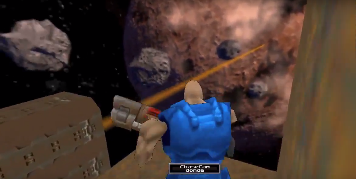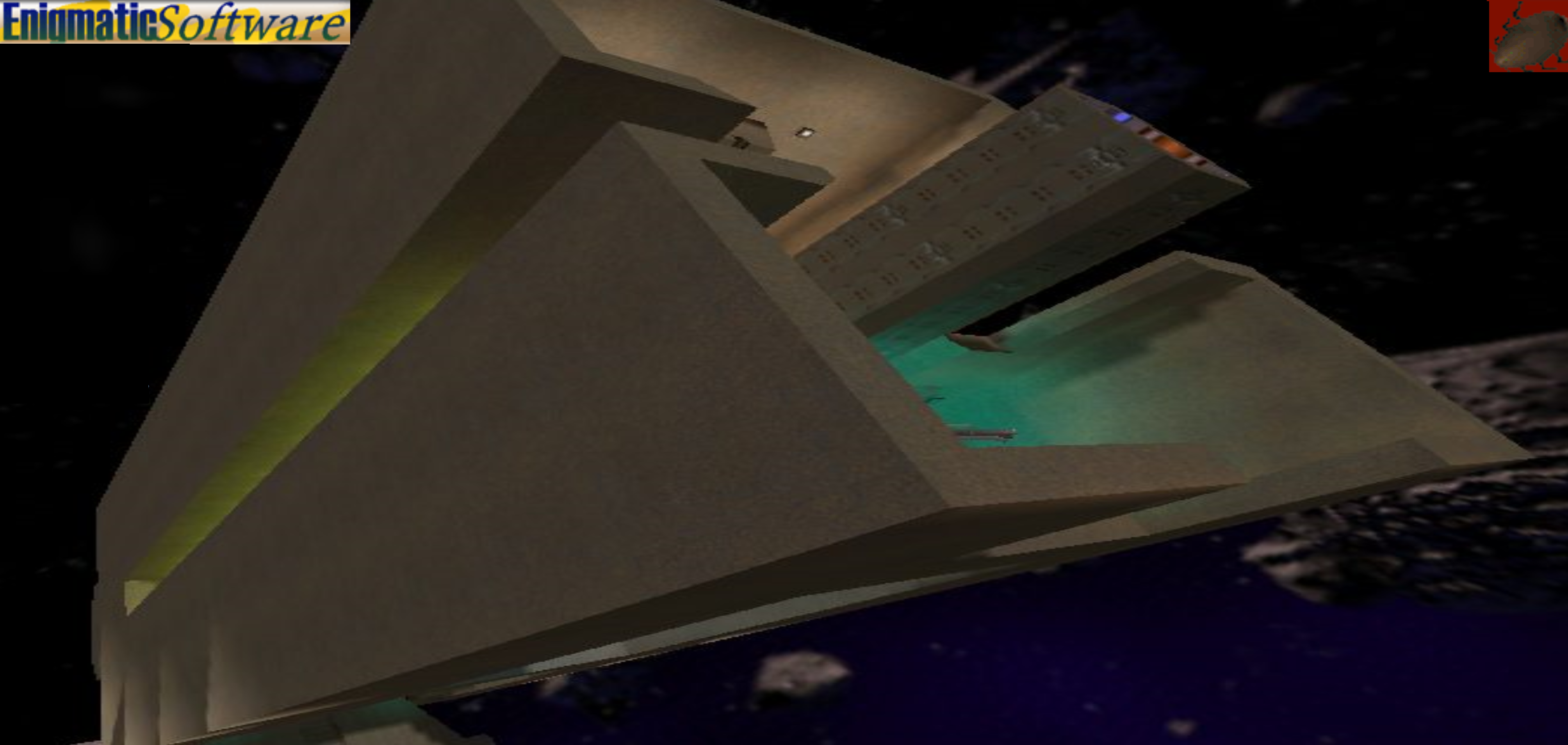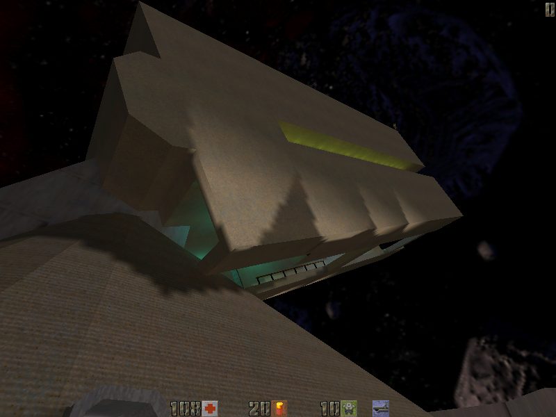 An older version of this map was my first experience with editing in Quake 2. The older version was an attempt to recreate the Big Gun as seen in the Quake 2 intro movie exactly. (I was disappointed with the Big Gun level in the actual game since it didn’t look anything like the intro movie Big Gun…Though I do enjoy deathmatching on it.) However, I kept running into the problem of the Quake 2 sky cube not being large enough to hold a full-scale version of that gun. Additionally, the inside of the Big Gun as seen in the intro isn’t very interesting to run around in. So I gave up on it and worked on other things during the past 18 months. Three weeks ago, I finally decided to give it another go, but this time I wouldn’t try to recreate the Big Gun as seen but instead create version that was interesting to run around in and also a bit smaller. Also, I knew there was no way to realistically make the ground extend as far as it appeared to in the intro movie, so I decided to change the setting for the gun completely and put it on a slowly rotating asteroid. This actually worked out great, since I was able to make it deadly to fall off the edge of the world. Therefore nothing from my original Big Gun attempt is in this map; I decided to get a fresh start as there wasn’t anything I could still make use of from my first attempt 18 months ago.