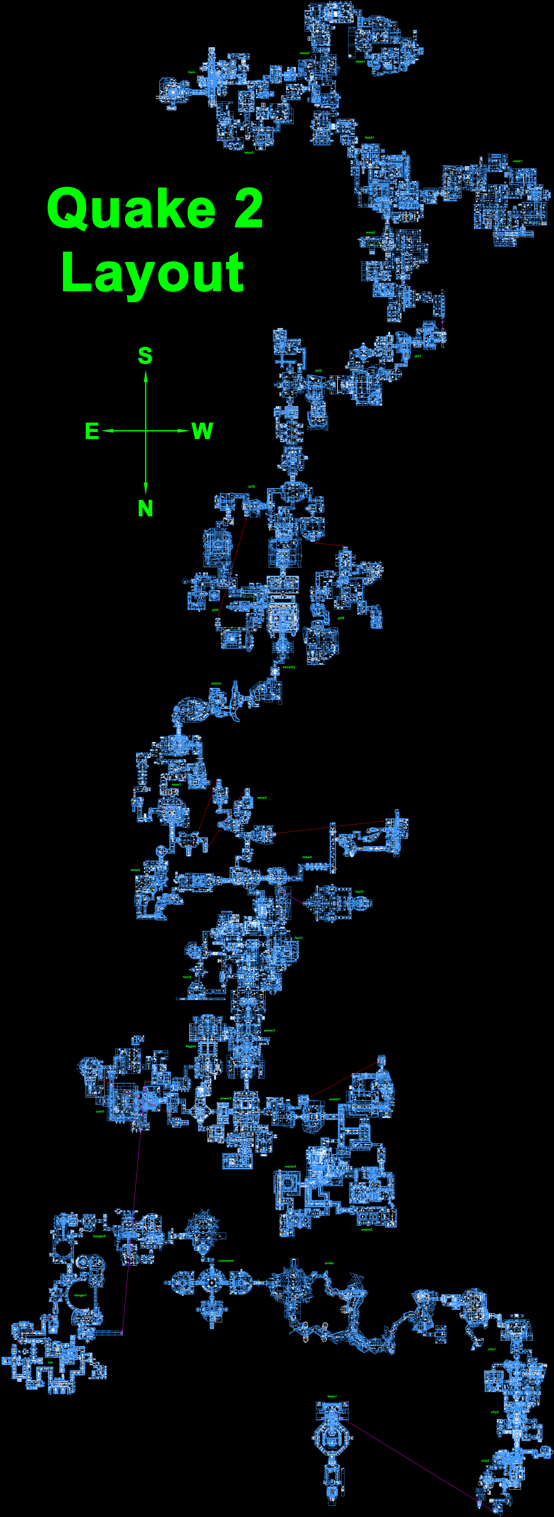 Speaking of which, the ring of invisibility was a bit of a problem. I solved it by substituting two items for it – in two of its locations I used the power shield, and in the other two I used the silencer. (Both very useful, IMO.) Health is pretty much the same as Q1, as is the two instanced of megahealth. An adrenaline was added to help combat the effects of accumulative quad damage in Q2. (See below.)