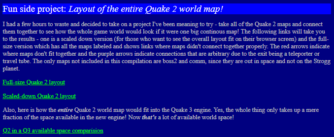 If you haven’t figured it out by now, “Elder God Ruins” is a remake of my favorite Q1 map, “Elder God Shrine” (E4M3). The former map is now in ruins, but despite these significant changes I have gone to a great many lengths to make this map play like the original on Q2. Dimensionally, the map is exactly like the original map – all the rooms are the same size, everything is in the original positions of the Q1 version. Note that this map does not use any decompiled Q1 map material. (This map was started long before WinBSPC existed.) I used Quark to jot down the basic room sizes of the original on a piece of paper, then I blocked out the map with large brushes. I then used the hollow tool to simply turn each block into a room or hall, deleted the overlapping end sections, and resized them so they all connected and didn’t leak. I then studied the original map in quake to see how all the room and hall details were layed out, and simply added them in. (The original E4M3 is really a simple map – most of the details like the ceilings are duplicated everywhere in the level and are symmetrical, so once I knew how a detail worked it could be repeated again and again.) In fact, getting the original map with all its details only took about a week’s worth of work in the entire project. Making the map look ruinous is what took most of the time afterwards!