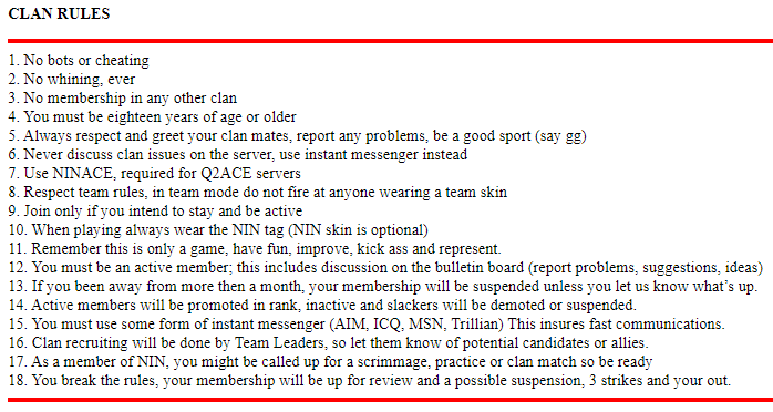 Quake 2 WODX Clan — Nine Inch Nails: NIN Skins, Members, and Code of Conduct On March 15, 2020March 16, 2020 By DondeIn Collection of Quake 2 models and skins, Community, Entities, Mods, Quake 2 art NIN Clan — Skins NIN Clan — Code of Conduct https://web.archive.org/web/20050223124635/http://www.netdoo.com:80/ninclan/code_of_conduct.html NIN Clan — Members https://web.archive.org/web/20030204173142/http://www.netdoo.com/ninclan/members.html NIN Clan — 3D Magic, by Mike Marcinek https://web.archive.org/web/*/http://3d-magic.hypermart.net/*
