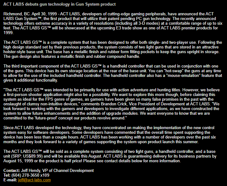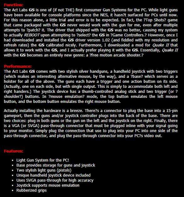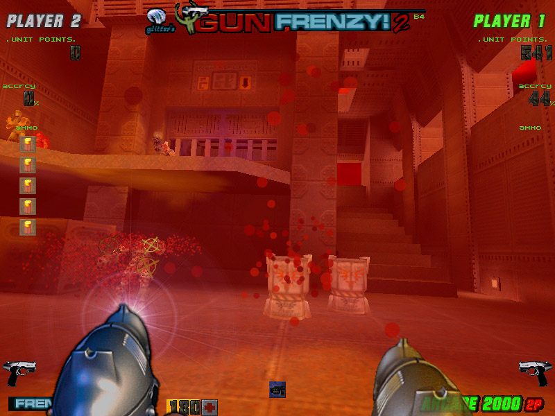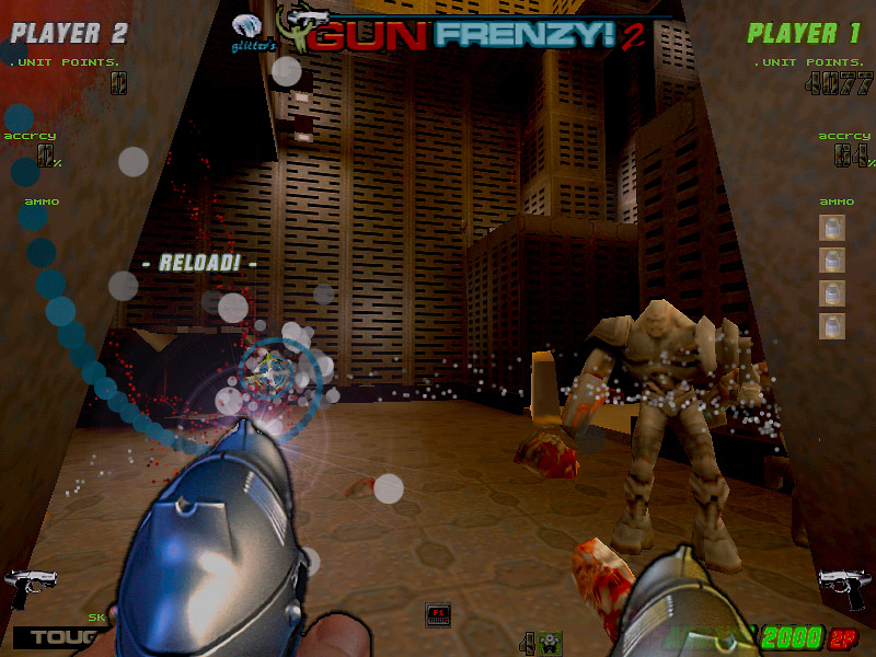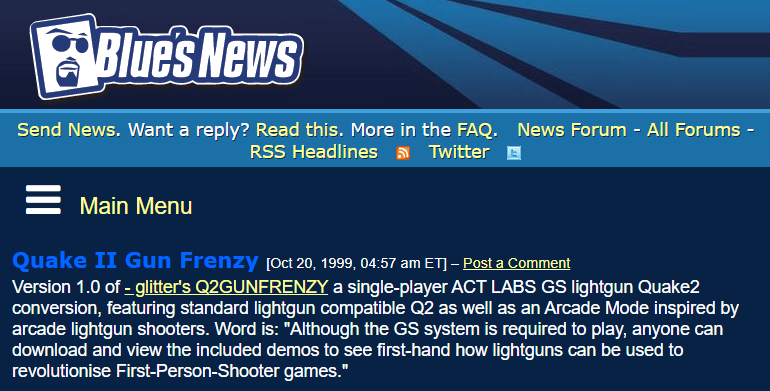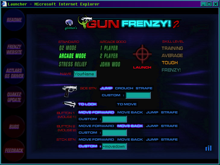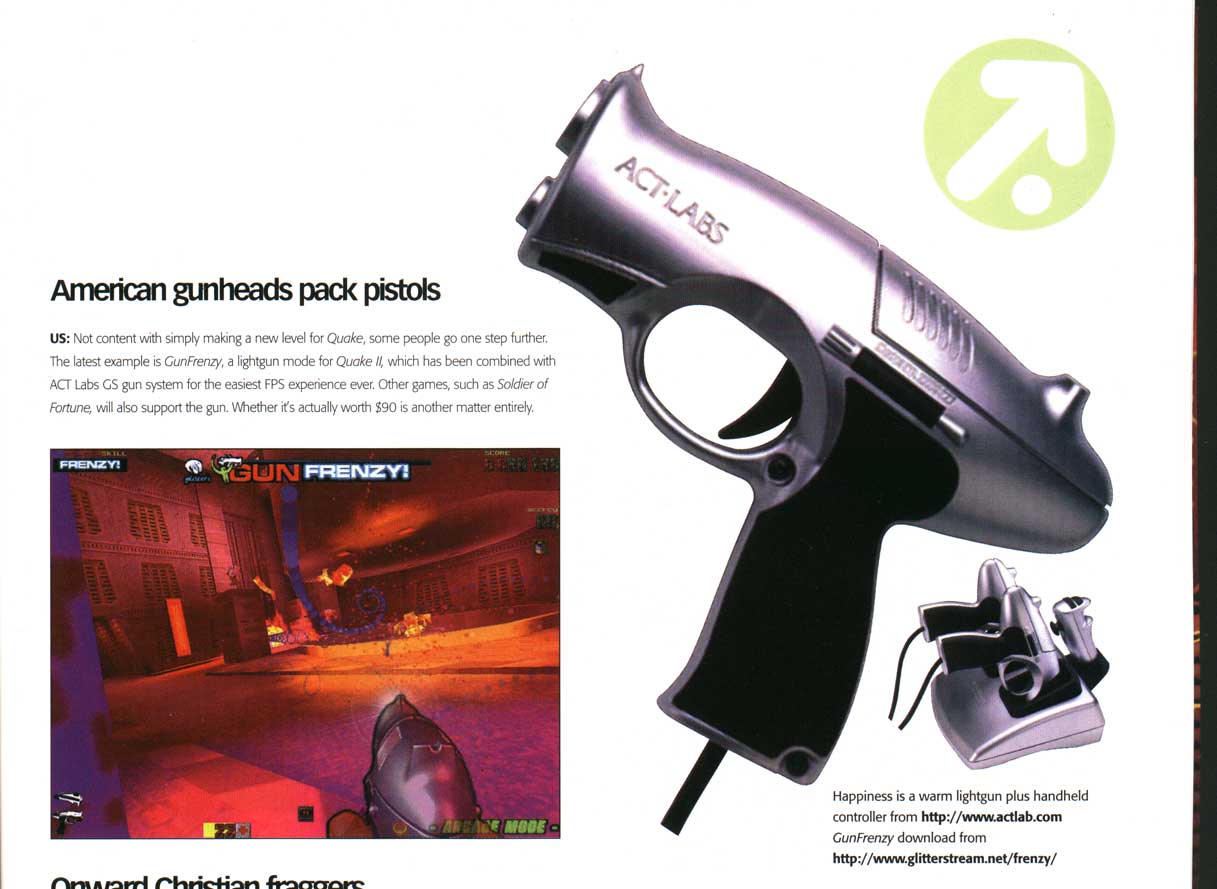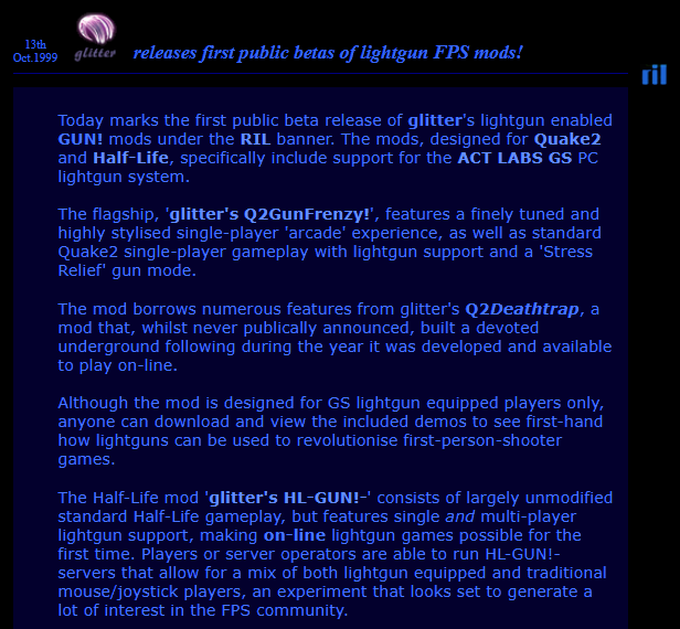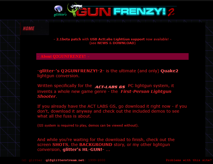 October 14th, 1999 — glitter’s Q2GUNFRENZY!, released today in version 1.0 under the >RIL_ banner, is the first ever lightgun enabled First-Person-Shooter game. Written specifically for the ACT LABS Gun System – PC lightgun system, it features a finely tuned and highly stylized Quake 2 single-player ‘Arcade Mode’, as well as standard Quake 2 gameplay with GS lightgun support and ‘Stress Relief’ mode.