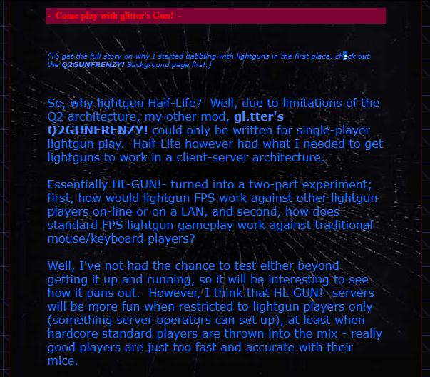 Web Authors: Please always link to rather than the Frenzy site directly. a pack containing glitter’s animated logo for linking to the – glitterstream – web site is available. A second lightgun mod for Half-Life is currently in beta (this can also be found at the – glitterstream – site) – although this one currently features mostly unmodified Half-Life gameplay, it does offer multi-player lightgun capability, including the ability to run dedicated on-line lightgun servers (GunFrenzy is single-player only due to Quake 2 architecture restrictions). However, please do not publicize this yet, as more work is expected on it fairly soon to bring it up to version 1.0.
