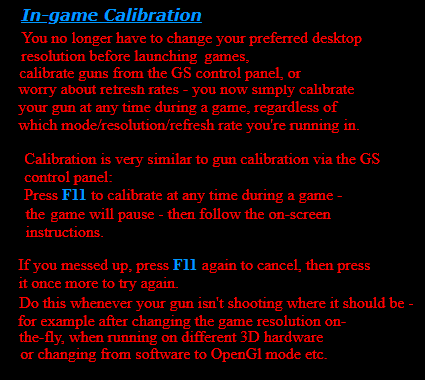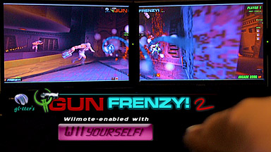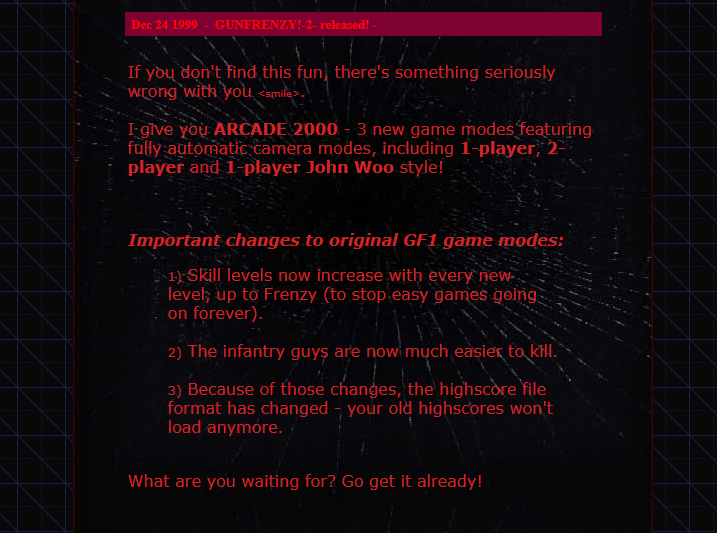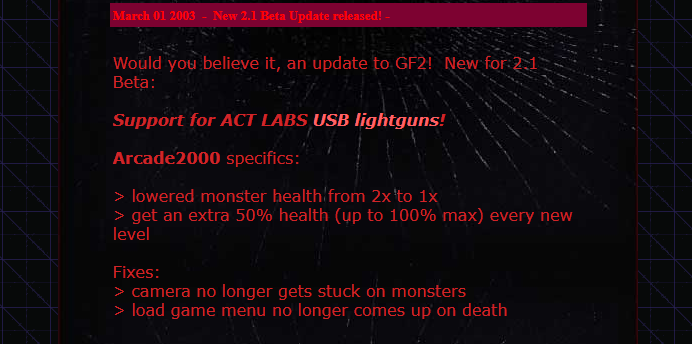 The mod borrows numerous features from glitter’s Q2Deathtrap!, a Quake 2 mod that, whilst never publicly announced, built a devoted underground following during the year it was developed and available to play on-line. Although the GS system is required to play, anyone can download and view the included demos to see first-hand how lightguns can be used to revolutionize First-Person-Shooter games. Full details (including screenshots, glitter’s notes about the mod’s origin etc.) are now on-line at the GUNFRENZY! web site.
