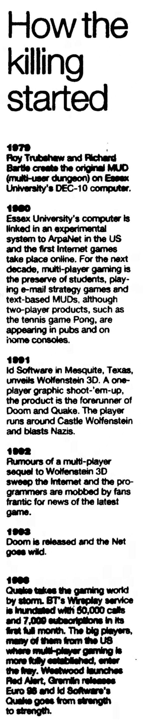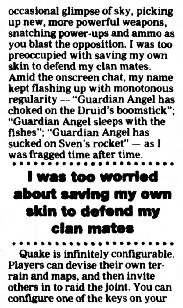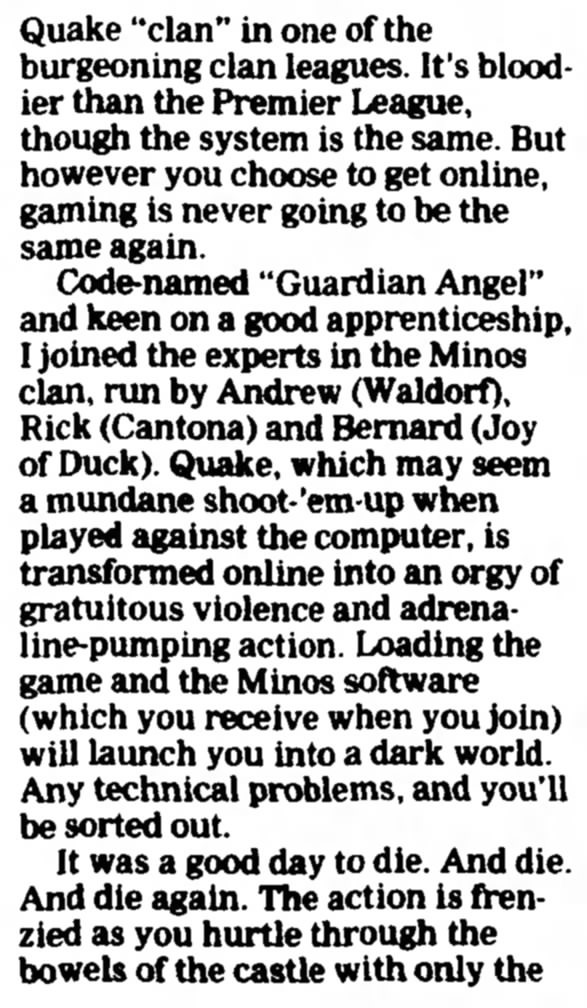 Make friends all over the world, and blast them into the next — The Guardian, Thursday, January 23, 1997 On March 20, 2020 By DondeIn Community, The Quake 2 community -Excerpt and images courtesy of Newspapers.com, The Guardian, Thursday, January 23, 1997 -Excerpt and images courtesy of Newspapers.com, The Guardian, Saturday, December 13, 1997