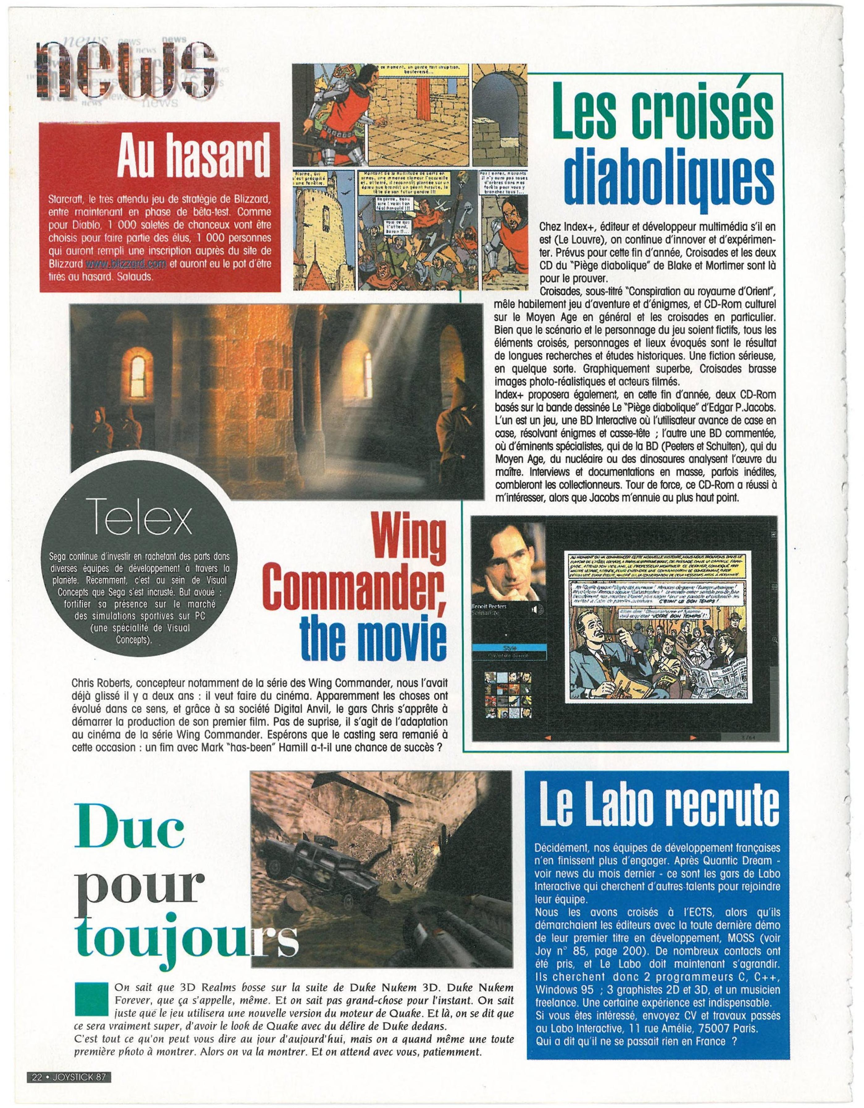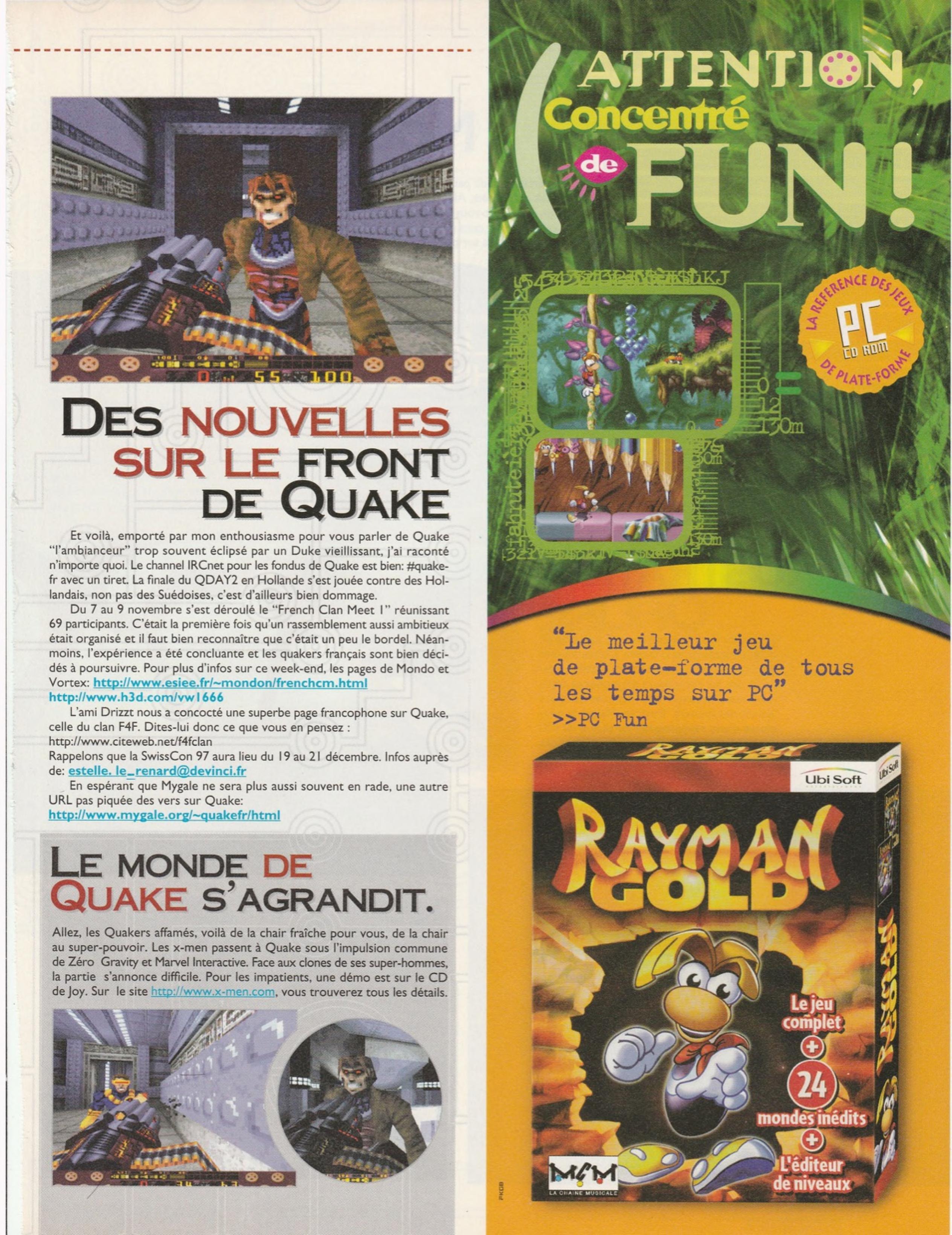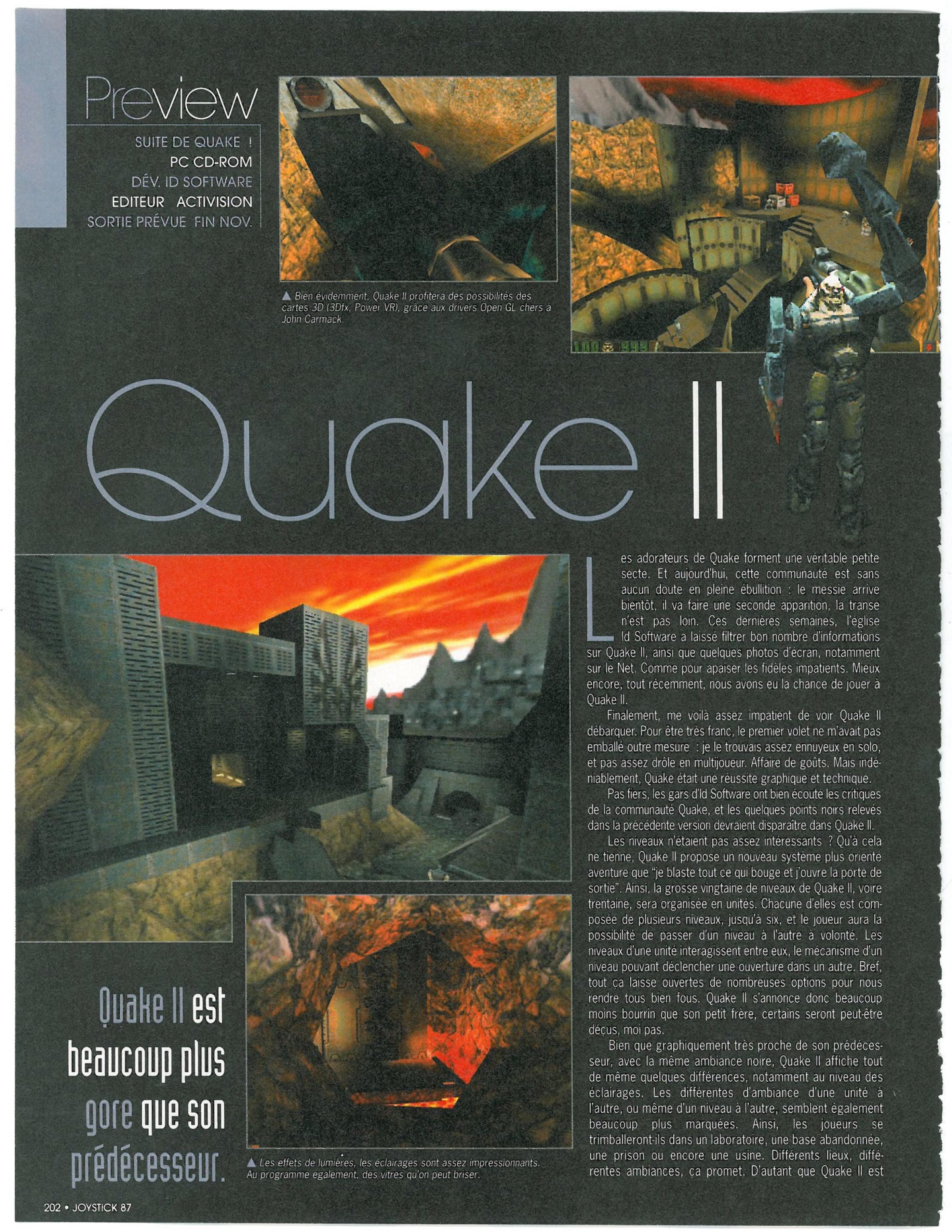 “Surtout que John Carmack, le genial designer-programmeur d’id Software, a annonce que le coeur multijoueur de Quake accepterait sans encombres des parties a 200 joueurs simultanement. Vous imaginez ca ? C’est plus du DeathMatch, mais de ventables batailles rangees. Reste a trouver les grosses becanes et les gens prets a les mettre en place pour offrir de telles parties. A suivre…”