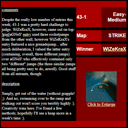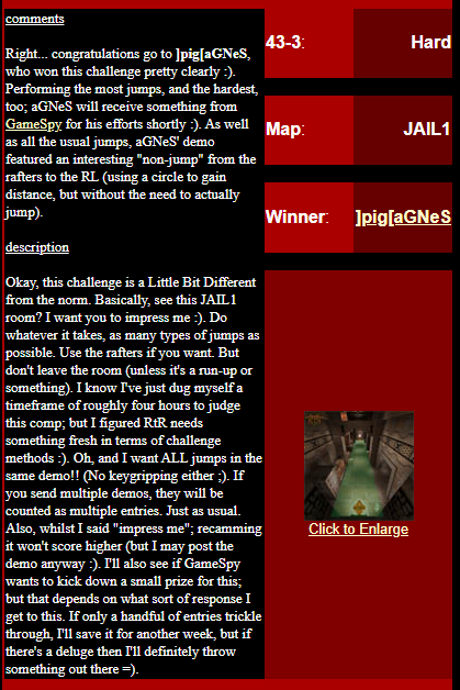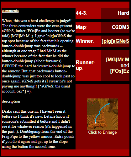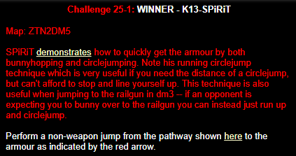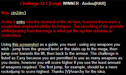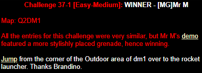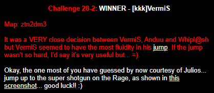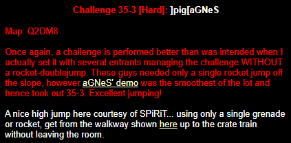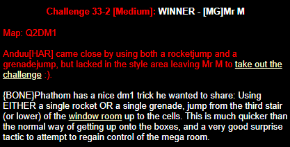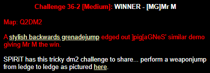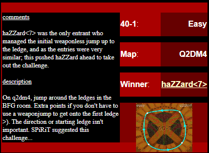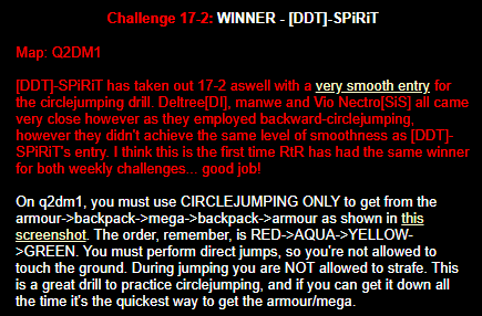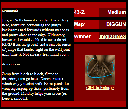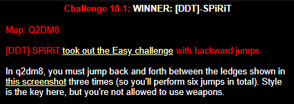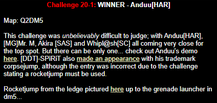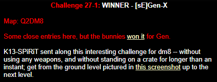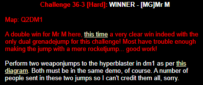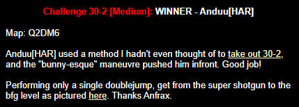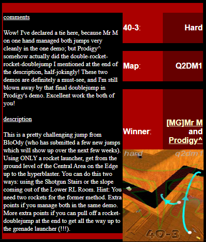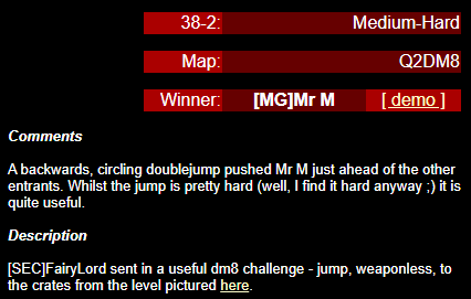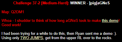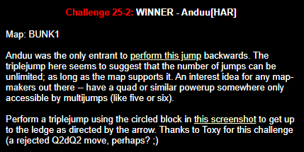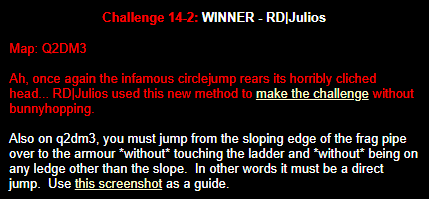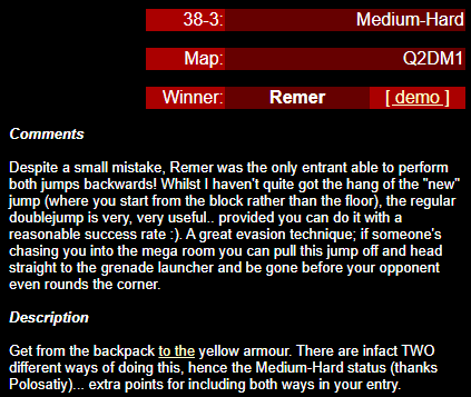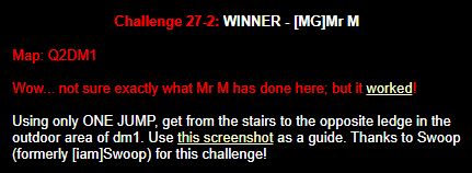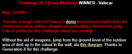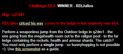 WINNER: Bain Excellent style! The BFG jump to the red armour is difficult to start with; let alone a falling one! On map q2dm2; perform a bfg-jump from the platform just above the water-filled room containing the two lifts (the platform has two ladders leading up to it) up to the red armour. Demo will be judged on completion of the task, and style.