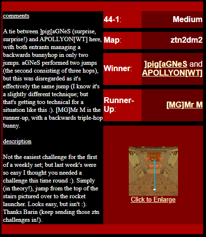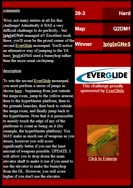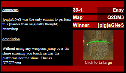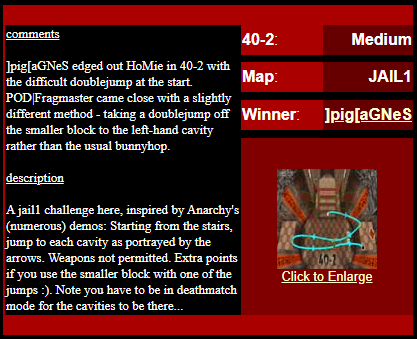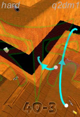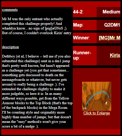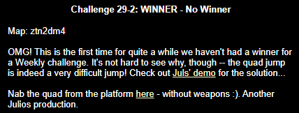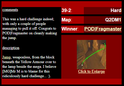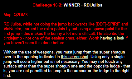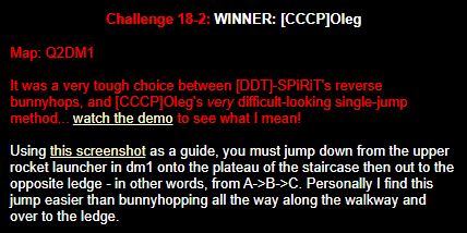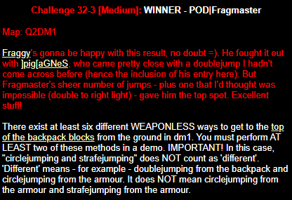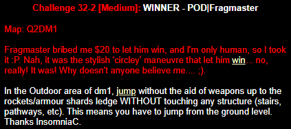 WINNER: No Winner. This, on the other hand; was rather difficult but ultimately quite possible. The trick was to flick-strafe-jump onto the top of the backpack blocks, and from there to the mega (or via the light, like I did in the demo: After getting the first jump right eventually I didn’t want to stuff up on the easy part :). Here’s my version. On map q2dm1 (again! Who’s bored of this map already? :), you must get from the armour in the megahealth room (on top of the blocks) to the megahealth without using any weapons and without touching the ground. Cheats of any kind (including changing sv_gravity) are not permitted. Demo will be judged on completion of the task, and the least number of jumps needed, and style (style may outweigh number of jumps in judging, however).