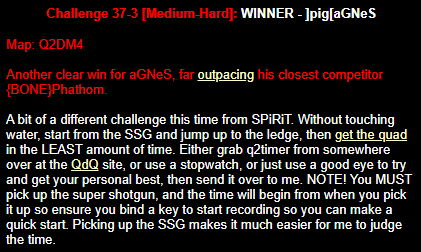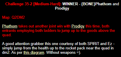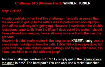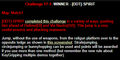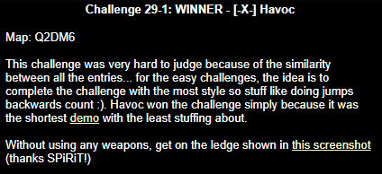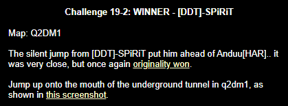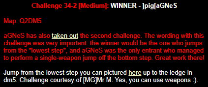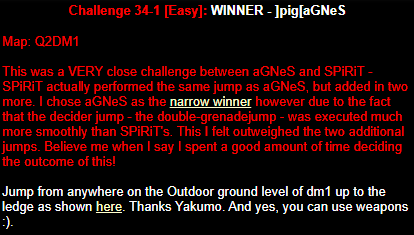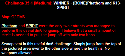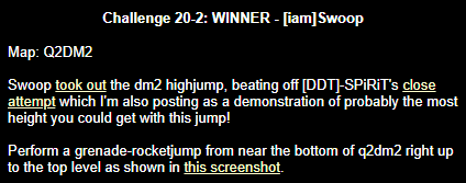 WINNER: Swoop Well, here it is; the jump everyone’s been waiting for… presented to you, in all it’s glory; by Swoop! On map q2dm1, WITHOUT using any weapons; you must get from the ledge containing the hyperblaster to the top ledge containing the grenade launcher. You MAY NOT leave the central area, and you are not permitted to use the big lift under the top ledge. Demo will be judged on completion of the task and style.