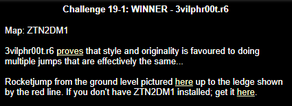 WINNER: No Winner. This wasn’t really that hard you know.. hell, if you had’ve just sent in a demo of you walking along the ledge you would’ve won! Here’s me doing a couple of the many possible jumps. Update: RD|Julios sent along this demo, and while it can not win for being late; it’s a great watch! On q2dm1, get to the ledge containing the rockets and health beside the railgun pool in as many different ways as possible. Different means you are not allowed to rocketjump from the ground AND the stairs. If you are not sure if two methods are similar; do them both anyway but only one of them may count. The winner will be given by who demonstrates, successfully, the most ways of getting to the ledge; and how stylish they were in doing so. Note: I want all the methods in one demo.