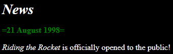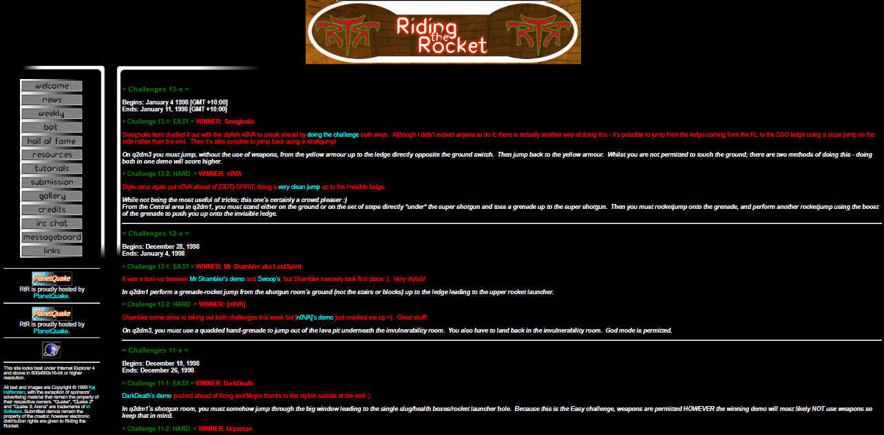 “Riding the Rocket is a Quake 2 Competitions website. Each week three challenges are posted of varying difficulty. Players can then submit demos of themselves attempting the challenges, and we nominate the most stylish entrants (usually; we also accept bribes) the winners for that week. The challenges usually involve some sort of trickjump, ranging from a simple rocketjump or doublejump to a more advanced circlejump or bunnyhop. Viewers are also invited to submit new challenges at any time. If we deem them suitable they will feature as a future weekly challenge.” -Kaj s8n Haffenden