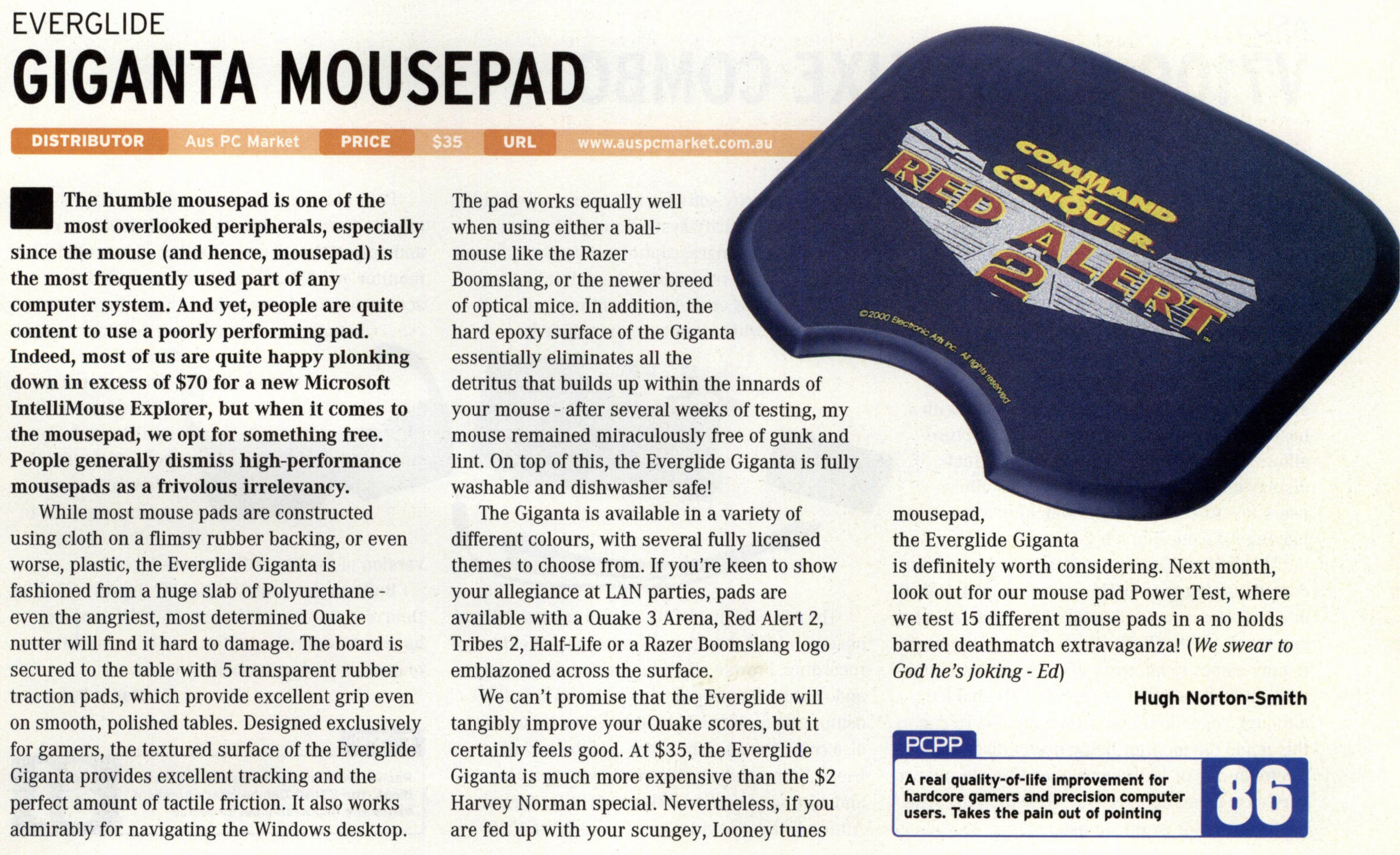 This review was meant to come a long time ago. It was interrupted by the biggest game of the year being released (HalfLife), practicing for Australia’s biggest lan event (Impulse 98) and various other real life constraints. I’d like to thank the Everglide ppl for sending me the attack pad and for being (somewhat) patient while I try and write up an objective review for quake-au.