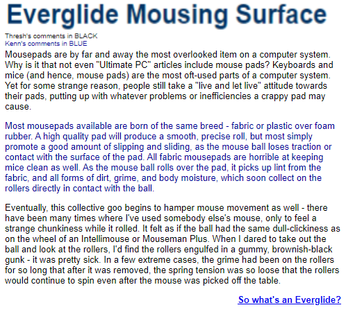 One issue of seen quakers mixed on is whether it’s good to have a mouse pad that makes your mouse slide fast or slow… This depends on alot of things, like the undersurface of your mouse, and it’s weight, but the pad also counts for alot. My experience with the logitech firstmouse (98 version) and the mouseman 96, was that the everglide actually feels slower than the 3M… I’m not exactly sure why, but I think it’s because the hard textured surface is actually wearing away the bottom of the mouse. That is, slowly over time the friction from the surface is going to wear away the underneath of your mouse alot faster than the 3M would. This isn’t really a bad thing, but might change your personal preference. I think personally I prefer to have as fast as possible, but without any slippage… My current 3M seems to go faster, but slips alot more. This made me trust the everglide a bit more, as it was a bit slower, but hardly ever slipped. (I haven’t really tested this theory that well, as I’ve heard comments that ppl find the everglide too fast… so you might want to try it yourself.)
