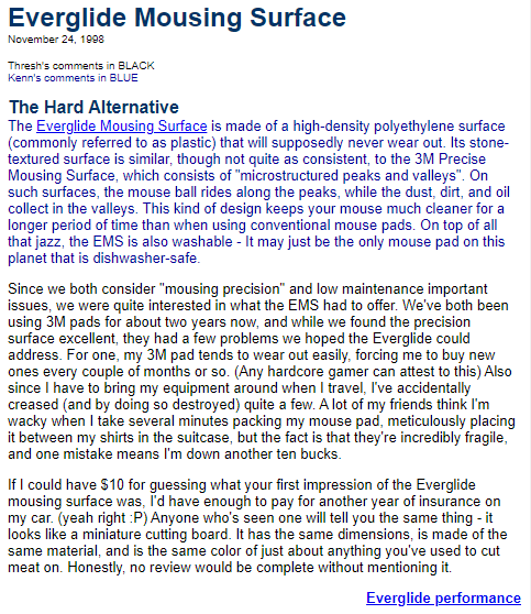 Well, I’ve used mine to death at home and I’ve lanned with it 4-5 times. At Impulse 98 I took it as well as my brand new 3M. I started with the everglide and I had decided if I had any probs I would switch back the 3M immediately… Well, the 3M never left it’s packaging… I had no problems… Other ppl who I have given the everglide to test it at lans have said found it to be similarly good… It’s hard to describe how the everglide works so well… It basically looks and feels like a white plastic chopping board. It is so hard that you can’t imagine your mouse gripping to the surface. But the plastic texture is just right so that after a while you can begin to ‘trust’ it, and soon you don’t even think about it… If you are used to using the very soft 3M’s, you will find the everglide very different, but it does work… Also, the surface texture of the pad is very consistent, which I think is very important. I can’t really tell whether the everglide works so well because it was designed to do so, or whether it’s simply due to basic properties of the plastic… I was at a supermarket the other day and saw some white plastic chopping boards, I was very tempted to buy one to try and use it as a mouse pad! I actually have one at home, but it’s got alot of knife cuts and stuff in it, so yeah, wouldn’t make a good mouse pad. :P