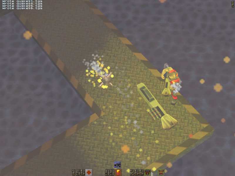 Note that cratejumping ONLY works if the block in question is in negative z-space on the map: That is, when the map was created, whether the block is under the z-axis. If you don’t understand that, don’t worry; just know that q2dm8 is pretty much the only deathmatch level that contains crates in negative z-space :). Anthony Bailey (leader of the Quake done Quick project) did write a mathematical proposed theory on the physics behind cratejumping, and if I can dig that up, I’ll post it here for interest’s sake.