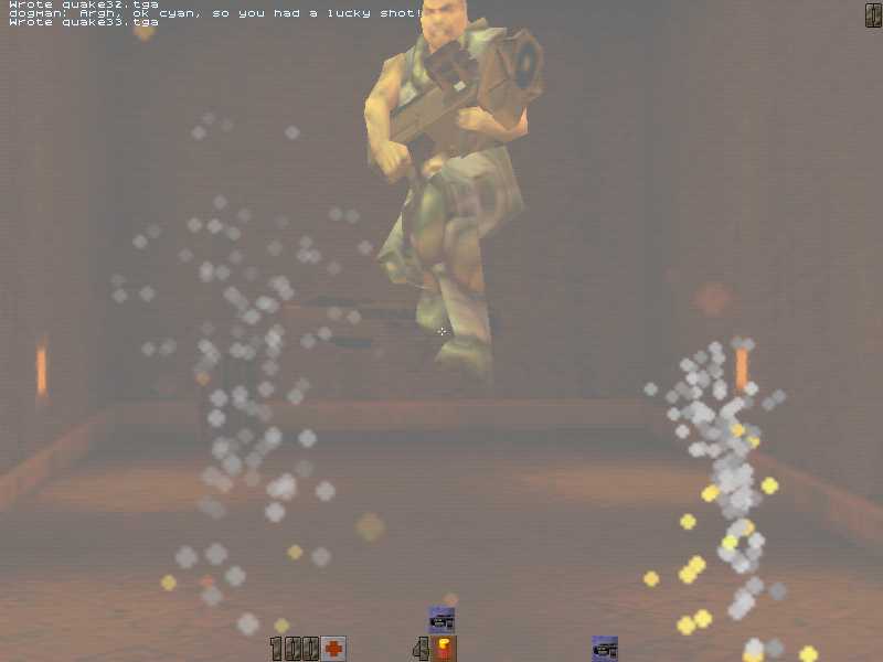 Explosive weapons are not the only weapons you can jump off – you can use others aswell. The catch is, they have to be fired by someone else :). This trick (called a third-person weaponjump) is very rarely used; personally I’ve used it maybe once or twice in a game where I was using the technique seriously rather than just playing around. It’s pretty much only practical with the super shotgun or railgun. The trick is to predict when your opponent is going to shoot you, then jump TOWARDS your destination just before they do and hope your opponent can aim ;). The last time I used it was playing against gladiator bots on q2dm1; I was out of rockets in the Outdoor Area and my opponent was dancing around my trying to land a rail. I didn’t have any other suitable weapons, but I did have a bit of health, so I positioned myself under the Rocks (where the rockets, health and armour are located) and dodged his shot. Then I stood still and waited for his next shot, and knowing that he would shoot the instant the railgun reloaded, I was able to time the jump and he hit my feet, launching me up onto the Rocks. Like I said, it’s very, very rare you’d ever use it; but it’s a pretty cool show-off trick so it’s worth trying out with a few mates on a LAN.