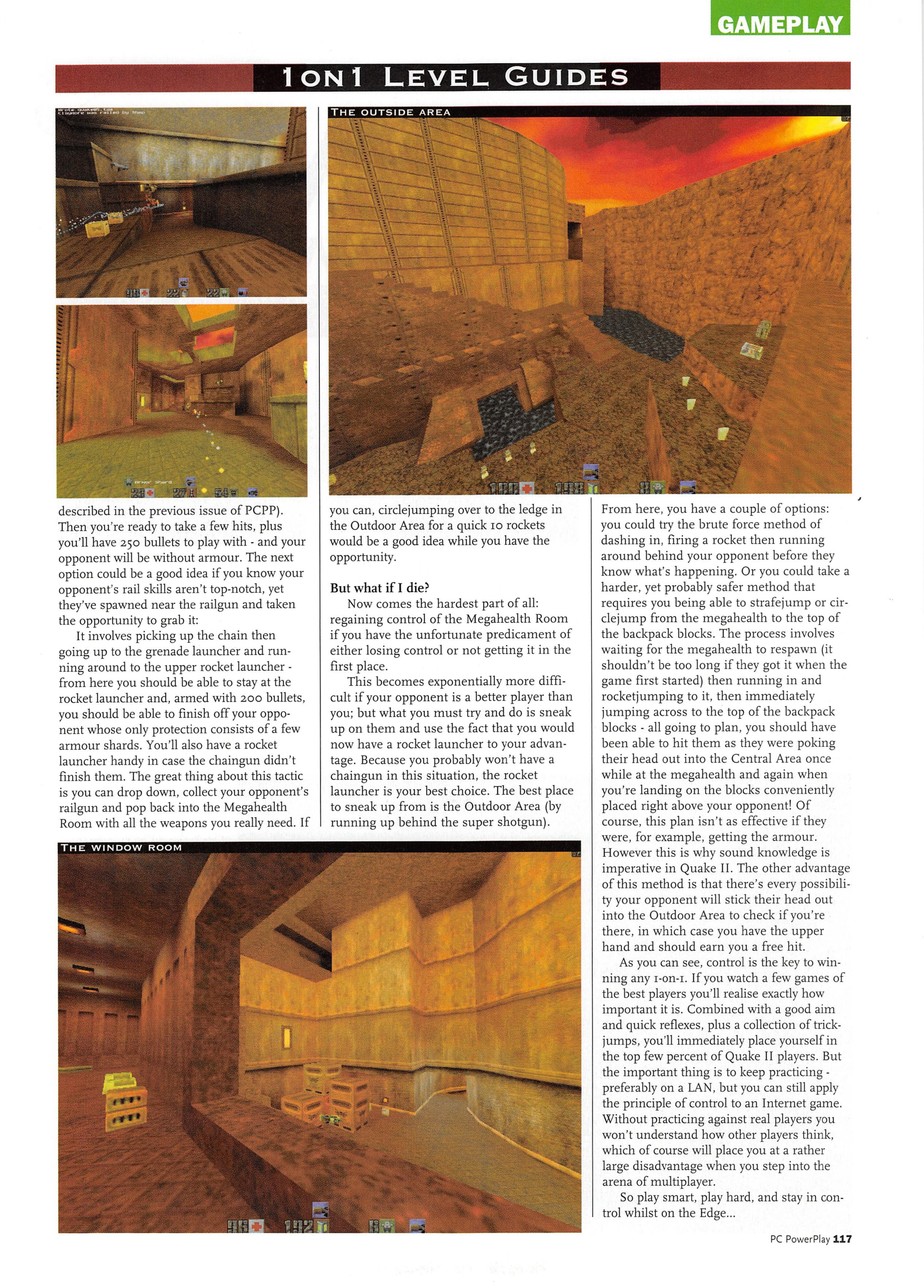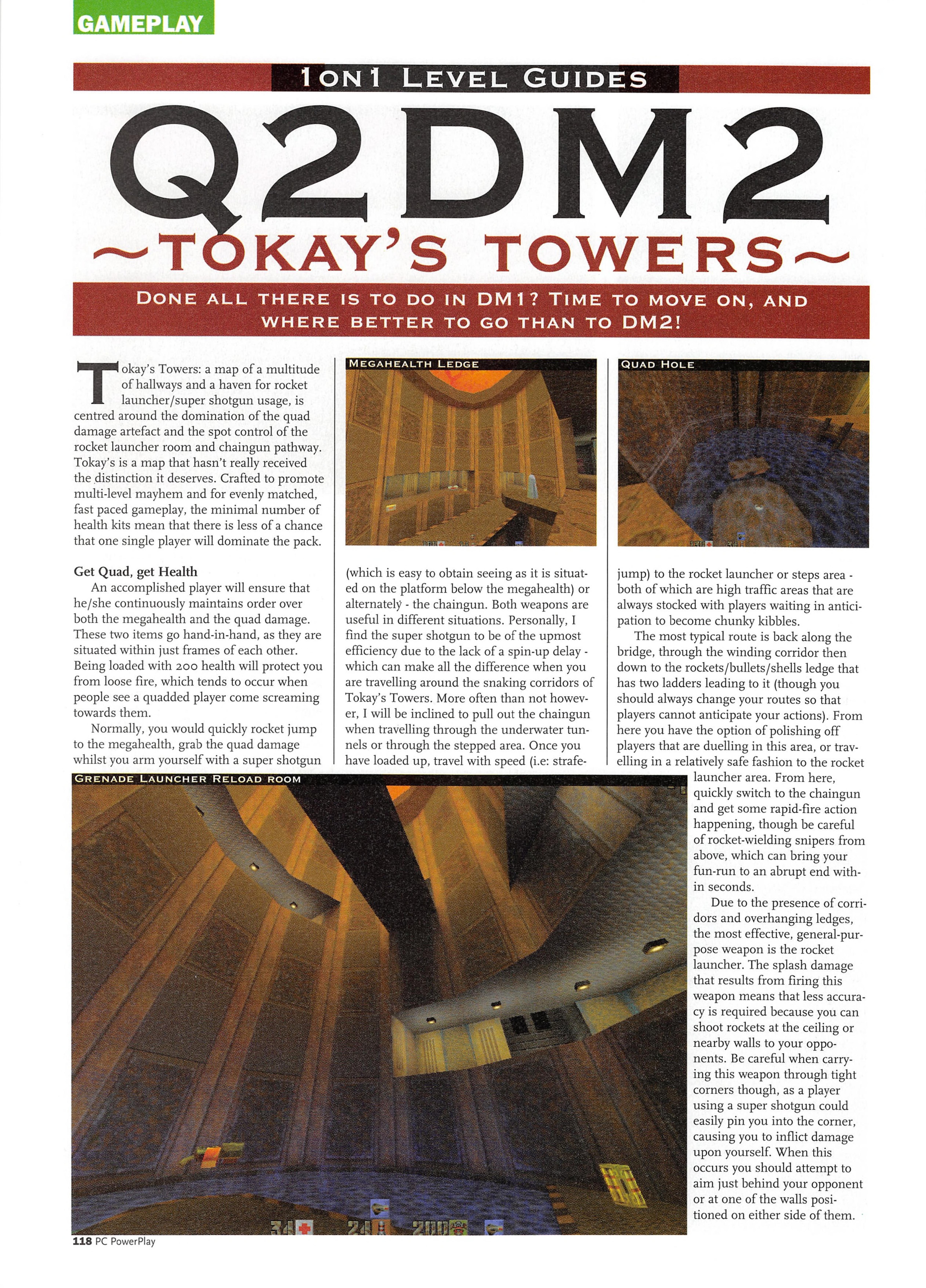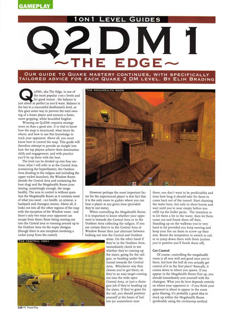 Quake II Uncovered — The Tips and Tricks of the Masters Explained Step by Step, by Kaj s8n Haffenden and Elih Caulfield Brading On April 1, 2020 By DondeIn Community, Entities, Maps, Skills, The Quake 2 community Q2DM1 and Q2DM2 Strategy by Elih Caulfield Brading -Excerpt and images courtesy of the Internet Archive, PC Powerplay magazine, Issues 036 and 037, June and July, 1999