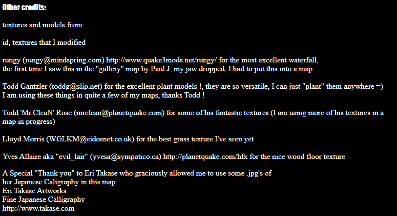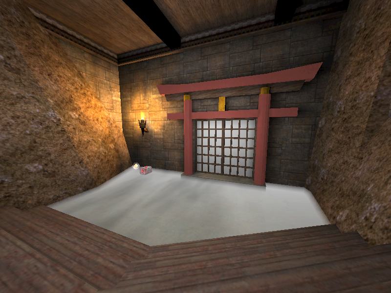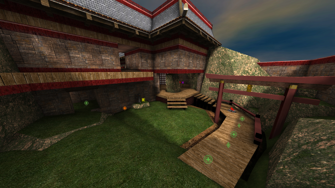 “g1zm0 brings years of level design experience to his first Q3A release level – and blows everything to date out of his way. What we have here are two levels (a CTF and DM) in one .pk3 that are just superbly designed and textured in a traditional Japanese style. One very small problem I had was a thin white fog at the bottom of some stairs seemed a little out of place.”