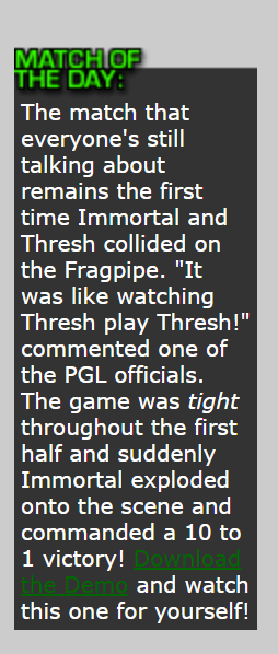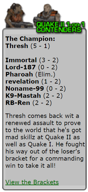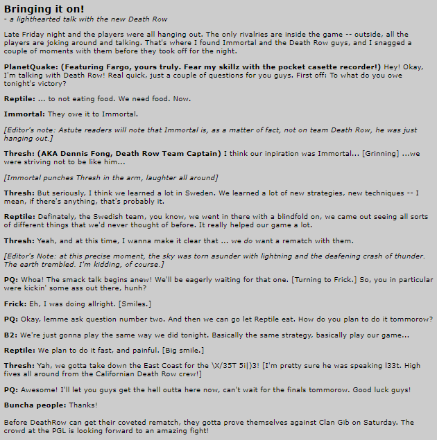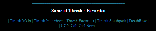 CGN GamesMania: Profile of Thresh — Some of Threshs Favorite Movies, 1998 On April 6, 2020April 11, 2020 By DondeIn Community, E-sports, Off Topic, The Quake 2 community FACE OFF In order to trap him… He must become him. CONAIR https://web.archive.org/web/19990209111530/http://movieweb.com/movie/conair/ THE ROCK The National Park Service — Alcatraz Island https://web.archive.org/web/19990208220217/http://www.nps.gov/alcatraz/ GOOD WILL HUNTING https://web.archive.org/web/19981203151719/http://cgn.gamesmania.com/profiles/thresh3_favorites.htm PlanetQuake — Special Feature: PGL Season 3 Coverage https://web.archive.org/web/19990203234855/http://www.planetquake.com/pgl/drinterview.shtml PGL 3 Championship — Photos https://web.archive.org/web/19991117101603/http://www.pgl.com:80/features/s3champs/images/*