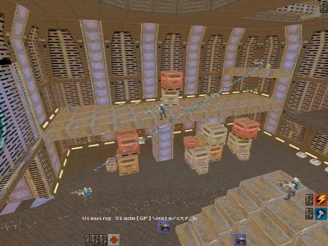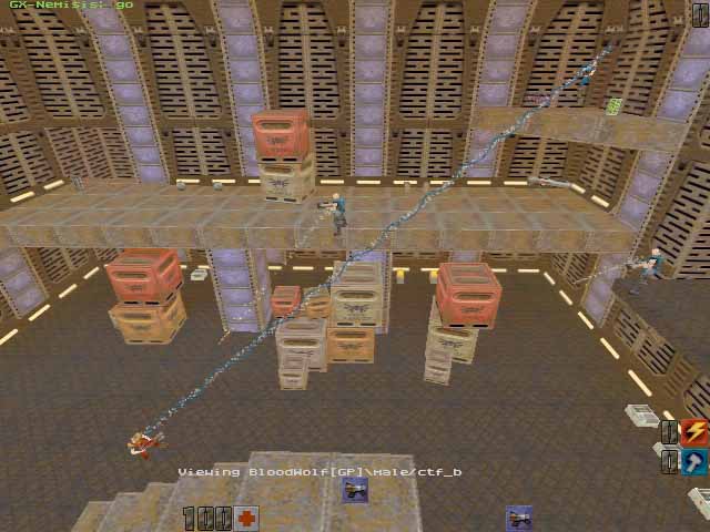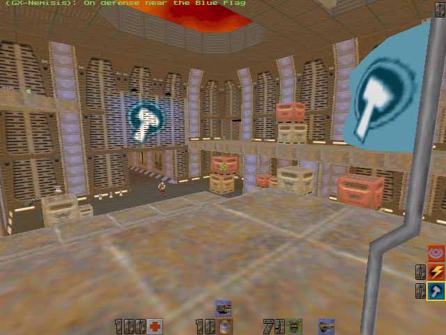 One of the most important aspects of CTF is the concept of the team. Unlike Deathmatch Free for all, where its all for none, CTF depends enormously on how well you can work with your team. Capturing the flag is never a job that can be performed by one person. The whole team must assist in some way to complete the cap. The defense needs to keep their flag in their base, while the offense needs to assist each other in bring the enemy flag home. Unlike team DM, where one person can carry a whole team, success in CTF requires full participation by every member of the team. I cannot stress enough how important your team is in CTF. You can be the best DM player on the block, but you can be next to worthless if you cannot be part of a team in CTF.