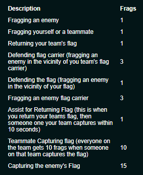 This is how your frag count is adjusted in CTF. Remember, that CTF is not about who can get the most frags, but which team has the most caps at the end of the game. You can rack up the most frags in a game, but your team can still lose if the other team has more caps. CTF in its purest form is based on caps only because this really says which team is better, not who can frag the best.