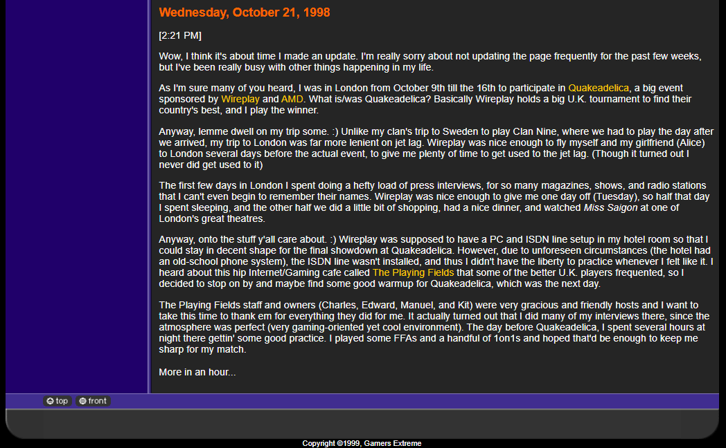 On the day of the event, I met some guys from the quaking scene, however, I think there was a lot more partying going on than gaming. D2-B2 and Makaveli would’ve loved it! Hey, we were thinking about you guys. It was held at the biggest night club in London, 300 showed up to watch the matches and about 700 were there at one point. Not much I can say about the matches because I’m sure you all saw the demos, but everyone was a real good sport, and there was lots of free beer to keep things going. None for me tho, thank you. :)