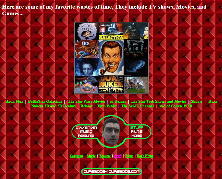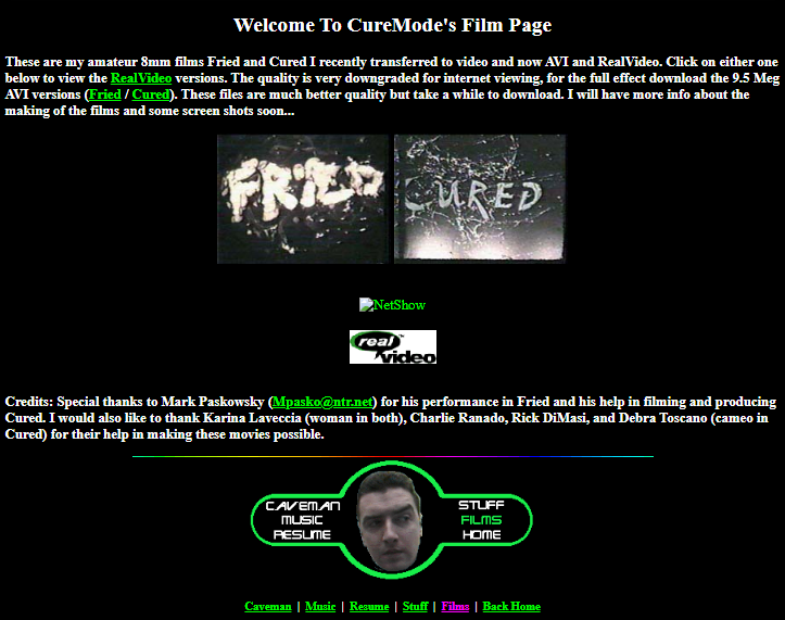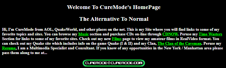“Hi, I’m CureMode from AOL and DWANGO. This is my new Site on New World Data’s Icebox Online, which will hopefully free me from AOL’s Evil Grip. Here on my Page you will find links to some of my favorite topics and sites. They include Bands, TV shows, Movies, and Quake info. Check out my new Quake section for info on the game and The Clan of The Caveman. I wish I could store all this stuff locally but my Server space is limited. Check out my Resume, I am a Multimedia Specialist and Consultant. If you know of any opportunities in the New York / Manhattan area please pass them along to me at…”