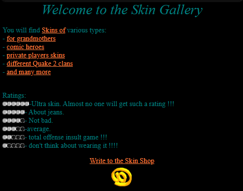 “Welcome to the Skin Gallery. You will find Quake 2 skins of various types — for grandmothers – comic heroes – private players skins – Polish Quake 2 clans, for example, Quassum, Shadow Warriors, STa, Dresiarza — and many more!”