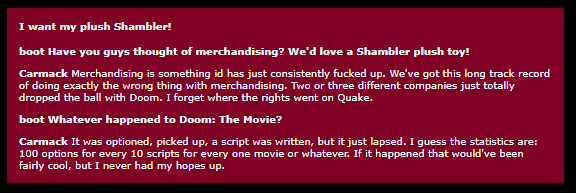 Carmack — That one crossed the line for me. I really don’t believe in attacking others. Still, it’s kind of interesting. Ultimately, I think it’s a good thing because it’s unedited commentary straight from the person’s mouth. There are usually too many layers of interpretation and spin between what somebody thinks and what people actually get.